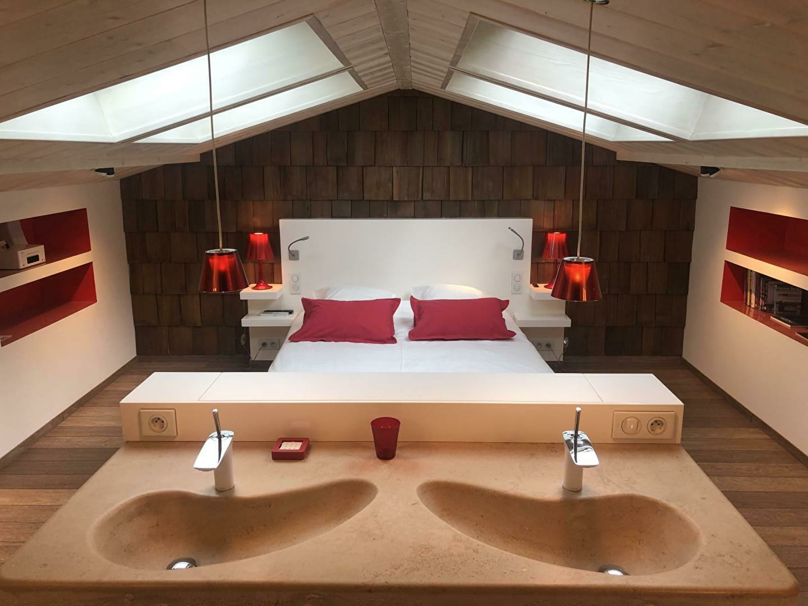 Poussez la porte de Vanadium et découvrez d'abord, au rez-de-chaussée, la cuisine équipée de plaques à induction et micro onde Siemens. Le rouge crée un contraste marqué immédiat et donne le ton. Ce lieu vous tapera dans l'oeil et son originalité ne vous échappera pas. Dans les niches se logent cafetière Nespresso, bouilloire Alessi, enceinte Denon et autre petit objet design, souvent de rouge vêtus. A l'instar du réfrigérateur Smeg qui rafraîchira vos soirées. Depuis la cuisine, accédez à la terrasse pour un moment de sérénité bercé par le chant des oiseaux (et quelques hennissements). A l'étage du gîte, un lit haut de gamme de 160x200 cm vous attend dans la chambre, baignée dans une lumière naturelle grâce à de belles ouvertures dans le toit. En période hivernale, une couette «Everet» et du linge de lit Carré Blanc vous réchaufferont. La chambre est tout confort: double vasque au bout du lit, grande douche à l'italienne. Cliquez sur un bouton, et une TV apparait comme par magie: un écran HD 55 pouces avec accès à Apple TV, Netflix, Canal+. Vanadium est joliment décoré de luminaires Fat boy et d'objets design