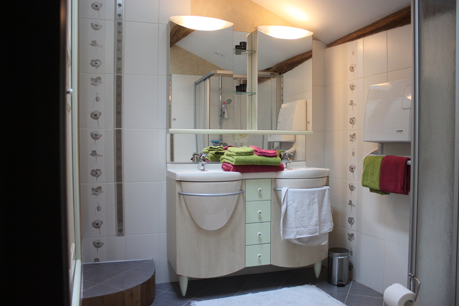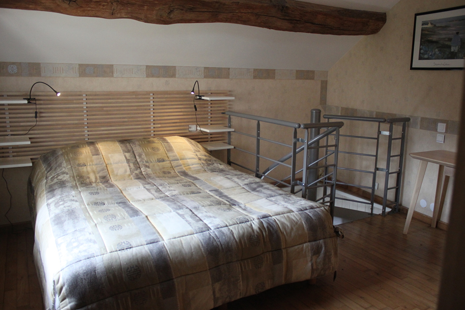 A l'étage, chambre 2 personnes, version loft, lumineuse, poutres apparentes, lit 160X200, grande capacité de rangement, salle d'eau-WC communicante.