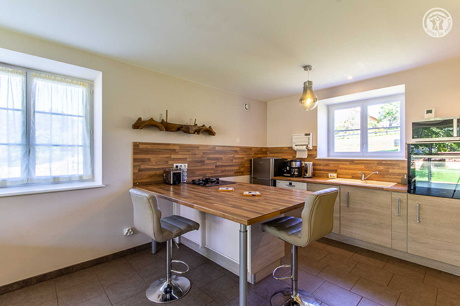 Composition : Gîte sur 2 niveaux mitoyen à l'habitation du propriétaire (indépendance totale). Wifi. Chauffage PAC (au sol sur chaque niveau). Rdc : séjour-cuisine-salon, Wc indépendant, vaste buanderie réserve (en accès direct depuis l'espace cuisine). 1er étage : 2 chambres (lit 2 p. 140x190cm dans chaque), salle d'eau (douche), Wc indépendant. Terrasse privée. Jardin privatif (espace réservé). Local vélos (dans buanderie). Parking privé. Piscine (7x3m) + terrain communs avec propriétaire. Commodités à 10 km.