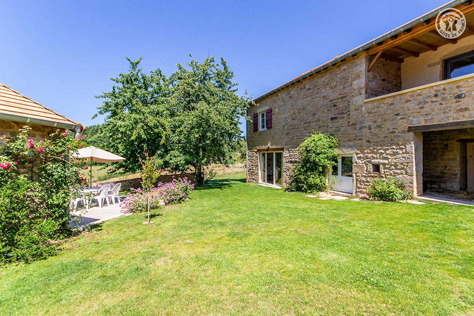 Ravissant authentique corps de ferme de caractère du XIXe, intégralement restauré dans les règles de l'art, niché "en balcon" à flanc de coteau sud-ouest au sein d'un charmant petit hameau rural résidentiel, adossé sur un plateau bien exposé dominant un bucolique cirque vallonné avec la "Butte de Suin" en toile de fond, iconique sentinelle panoramique de Saône-et-Loire culminant à 600m d'altitude. Calme absolu en pleine campagne clunisoise, en lisière immédiate de prairies (avec les paisibles vaches charolaises comme proches voisines en saison) & d'une vaste forêt domaniale en grande partie protégée en "Zone Natura 2000" pour son remarquable écosystème (parsemée de nombreux chemins de randonnées balisés en pleine nature dont le GR76 qui serpente sur ses crêtes). Cadre & site champêtre de montagne douce littéralement enchanteur, au creux d'un magnifique écrin préservé de nature & verdure, alternant vastes bocages, étangs, rivières et collines boisées. Belle vue dégagée. Superbe panorama & paysages. Particulièrement soignée & fleurie, cette vaste propriété ouverte sur la campagne environnante propose une belle piscine (7x3m), une large terrasse panoramique exposée, un agréable jardin privatif "à l'ombre" d'un majestueux merisier, le potager du propriétaire (cueillette de légumes frais possible avec son accord !) et un vaste espace engazonné en commun. Spacieux gîte de très bon confort. Chaleureux cachet campagnard aux accent contemporains. Ambiance zen & douce.