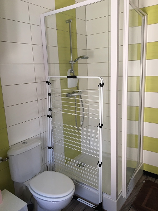 - une grande salle d'eau indépendante entièrement carrelée avec cabine de douche, lavabo et toilettes
