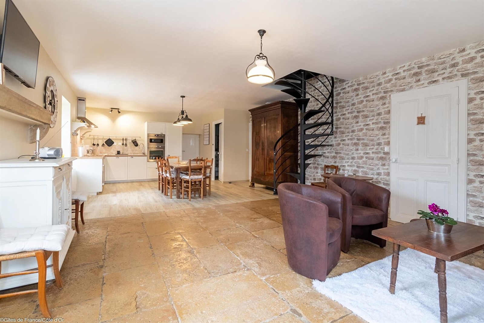 Au rez-de-chaussée : grand séjour ouvert avec dalles de Bourgogne dans le salon, salle à manger et cuisine équipée (plaque induction). Une chambre avec un lit 140. Salle d'eau avec douche à l'italienne. WC indépendant.