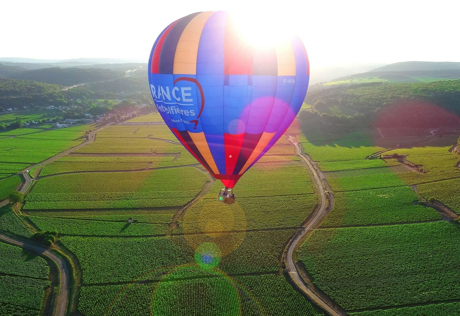 Imaginez la lumière enchantée de l'aube ou du crépuscule. Un ballon décolle sans une secousse, s'élève et glisse doucement, sans un bruit. Sous la nacelle défile un paysage à vous couper le souffle : les vignobles prestigieux de Beaune, la colline éternelle et la basilique de Vézelay, les châteaux de la Loire, les volcans d'Auvergne.