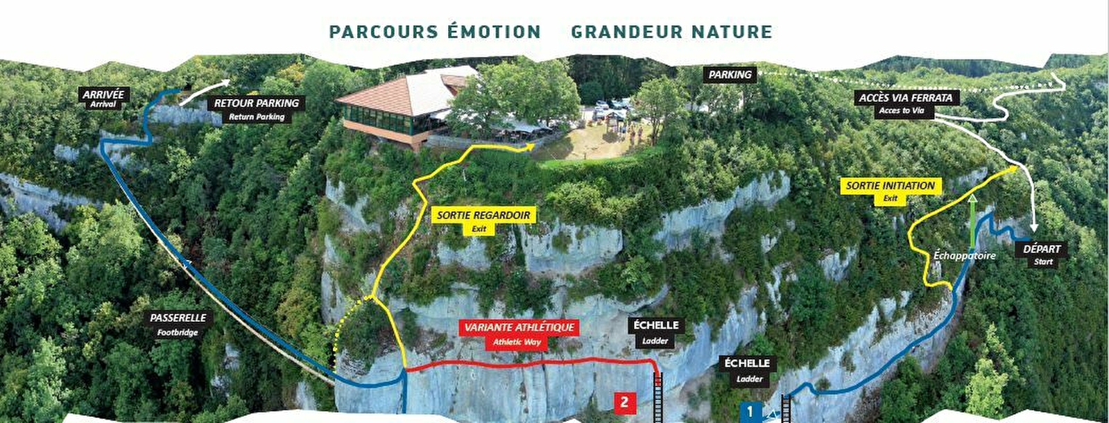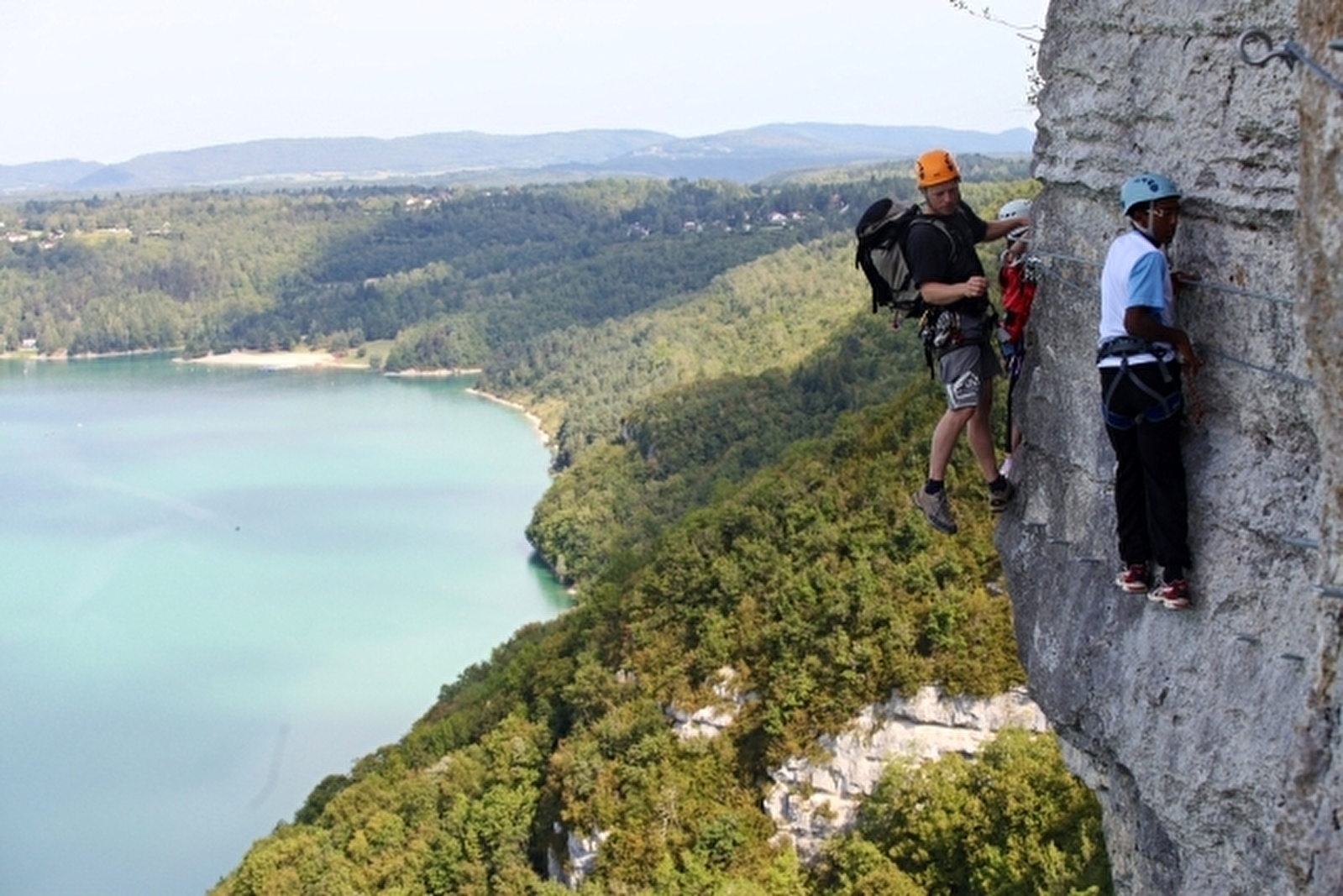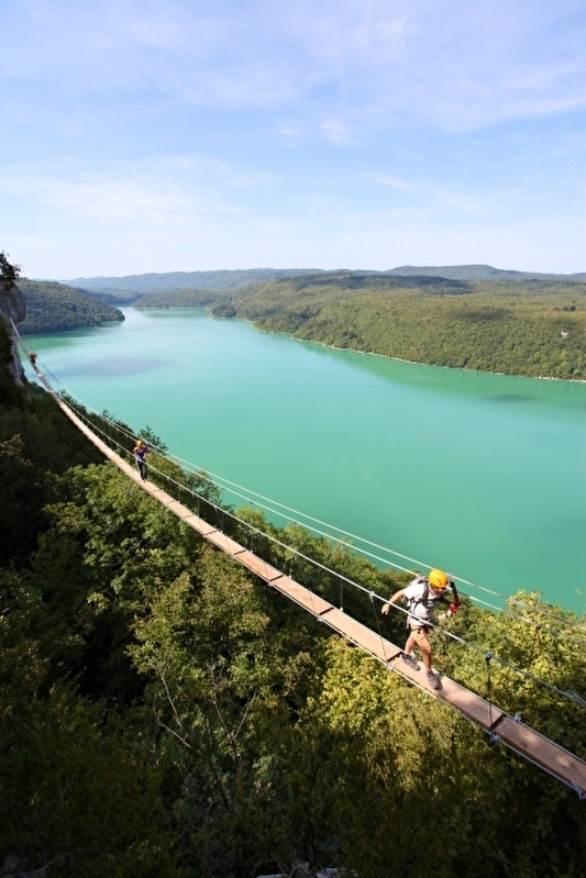 Via Ferrata de niveau AD (assez difficile) à D (difficile) (selon les variantes empruntées). Vous y trouverez une passerelle, deux échelles et un pont de singe. Longue de 350m, la via ferrata saura ravir les plus expérimentés par des variantes sportives, mais aussi les amoureux de la nature avec une passerelle de 90m surplombant le lac de Vouglans.
