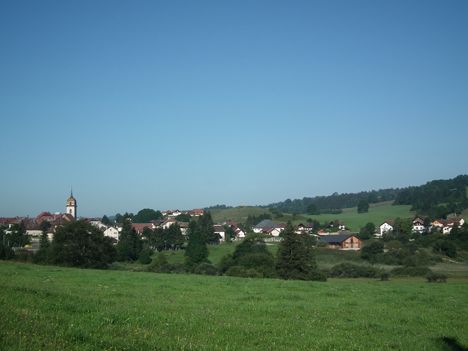 Ici, le Doubs n’est encore qu’un torrent vif et clair, parfait point de départ. Depuis ses rives, l’itinéraire s’élève tranquillement jusqu’à Rochejean, dont on traverse le cœur et l’église typique avant de replonger brièvement vers la rivière, histoire de changer de versant.