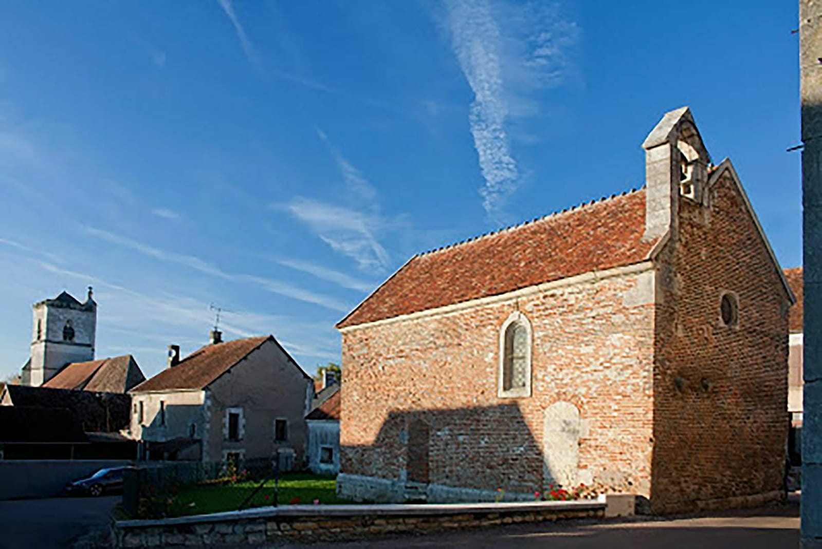 (D/A) Partir en contournant l'église par la droite (suivre le chemin qui longe les tilleuls). Rejoindre la Rue de la Chapelle. Avant la station service, virer à gauche dans la Rue des Courgelles. Prendre ensuite la première à droite. Dans la grande courbe, quitter la route pour prendre en face le chemin. Au carrefour en T, tourner à droite.
