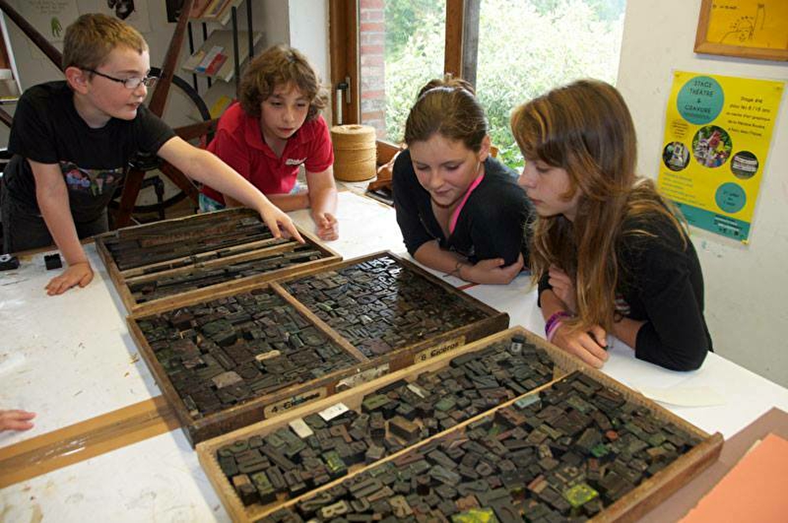 En atelier, à partir d’un dessin, les enfants découvrent le plaisir de la gravure. Sur cuivre, bois ou encore brique de lait, les classes abordent les différentes techniques de la gravure mais aussi le monotype, la typographie... Une fois qu’ils ont gravé, les apprentis imprimeurs encrent leurs plaques et impriment sur une presse à volant. En visite, les classes découvrent les différentes techniques de fabrication d’une estampe, d’un livre ou d’une affiche.