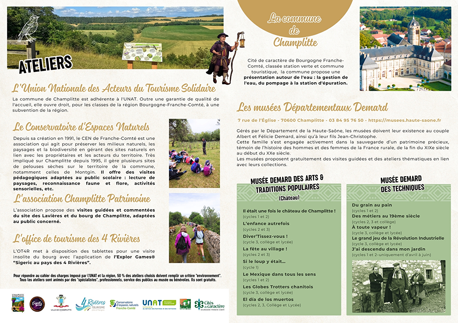 ateliers complémentaires : voir document photo (nature : avec le conservatoire des espaces naturels pelouses sèches, vignobles, sentiers d'interprétation des pierres sèches, la distribution de l'eau du pompage à la station d'épuration, visite pédagogique de Champlitte, jeu explor'games etc...)