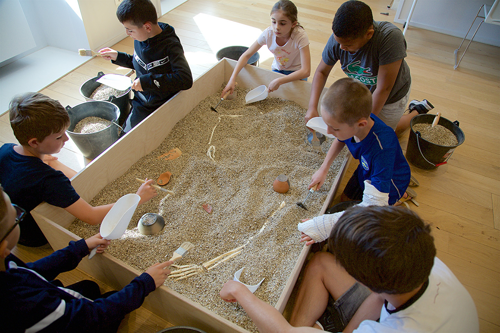 • En salle pédagogique, les enfants s’initient à l’archéologie, à ses métiers et découvrent les outils des professionnels.
