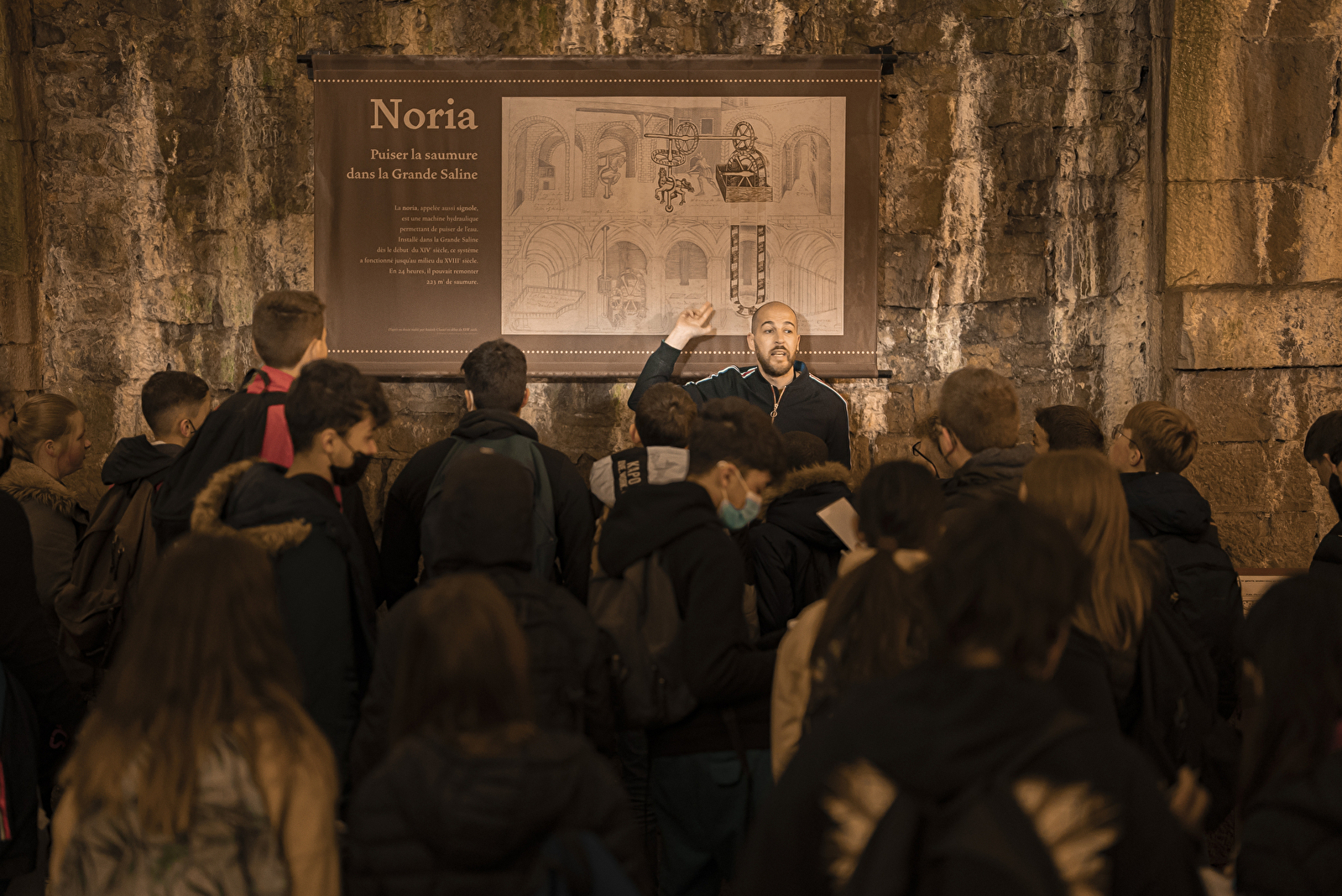 Grande Saline : au fil de la visite, le médiateur fait voyager les élèves dans l’histoire et l’architecture d’un site exceptionnel. Les travailleurs du sel, les sauniers, ont produit à la Grande Saline l’Or Blanc pendant plus de 1200 ans ! Au cours du temps, l’ingéniosité humaine a permis la mise en place de remarquables systèmes techniques, encore opérationnels aujourd'hui, pour puiser l’eau salée et la faire évaporer dans d'imposantes poêles à sel. Les élèves découvrent l’industrie du sel ignigène (en chauffant l’eau salée). Ils appréhendent la longévité extraordinaire de cette saline à travers des repères chronologiques et observent les spécificités techniques des mécanismes employés pour puiser l’eau salée et la chauffer.
