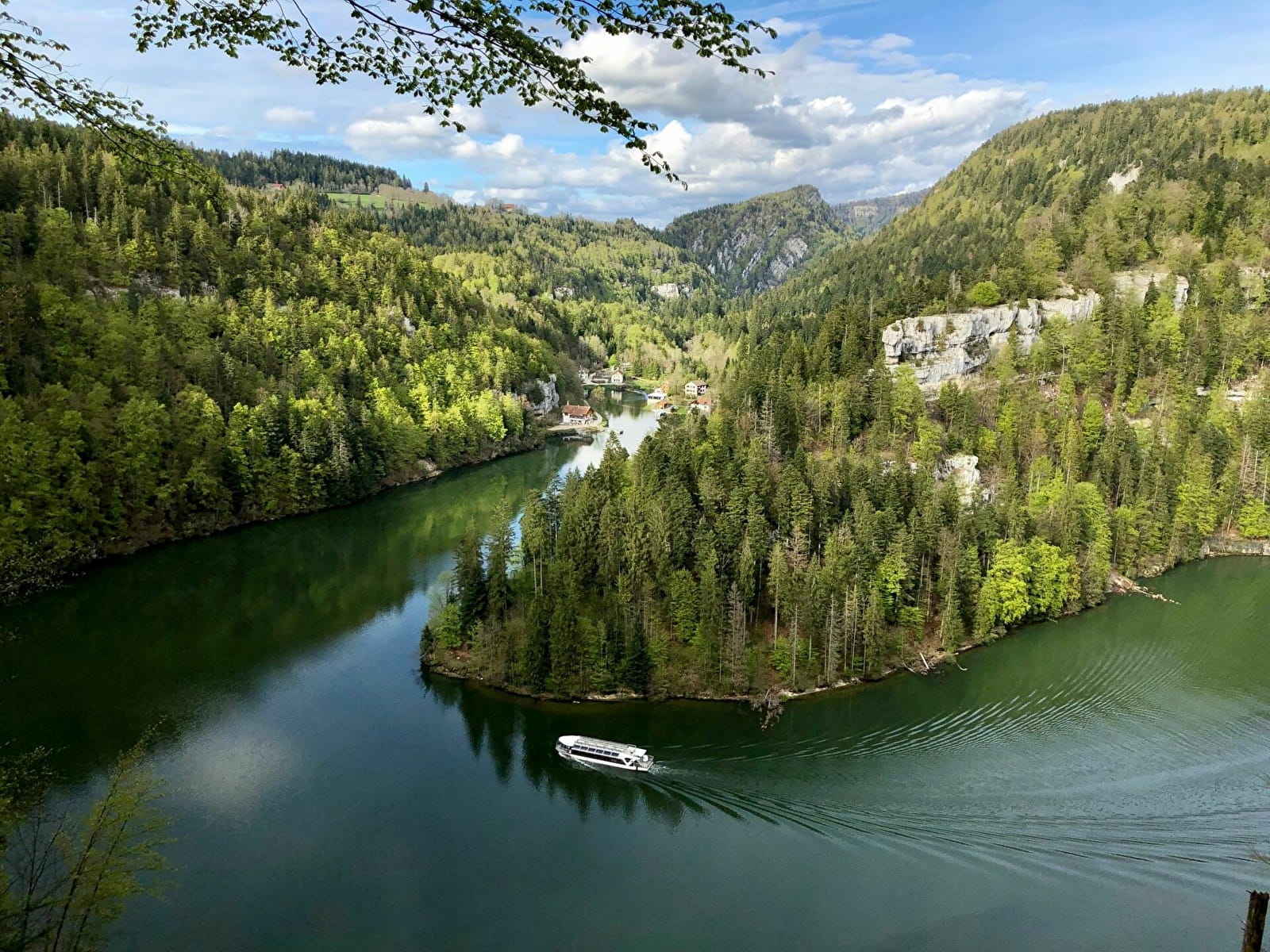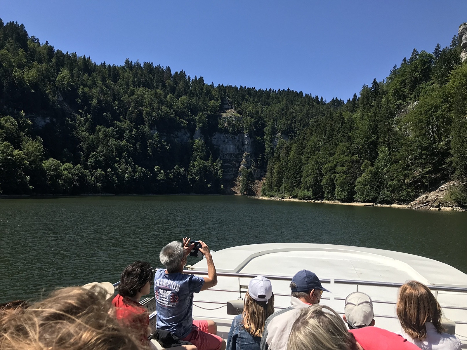 Nous sommes ici sur un des sites naturels les plus visités de la région, qui attire quelque 300 000 visiteurs par an. Rendez-vous pris à Villers-le-Lac pour l’embarquement. Il faudra trente minutes pour boucler le voyage aller, en naviguant sur les méandres de la rivière. Les Gorges du Doubs, étonnant canyon au faux air de Canada, dont les hautes falaises abruptes et sauvages semblent toucher le ciel.