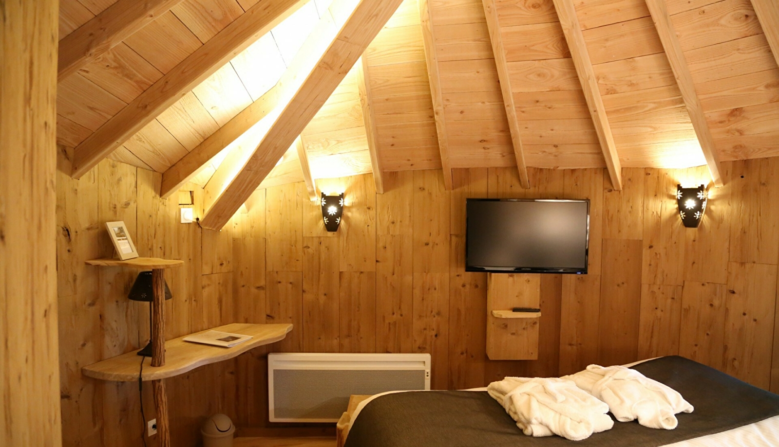 Pinocchio : cabane installée dans les arbres comprenant une pièce équipée qui peut accueillir 2 adultes et 1 enfant de moins de 12 ans. Elle est équipée d'une baignoire balnéo, chromothérapie, wc, douche à l'Italienne.