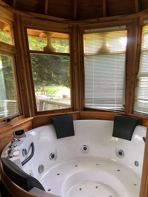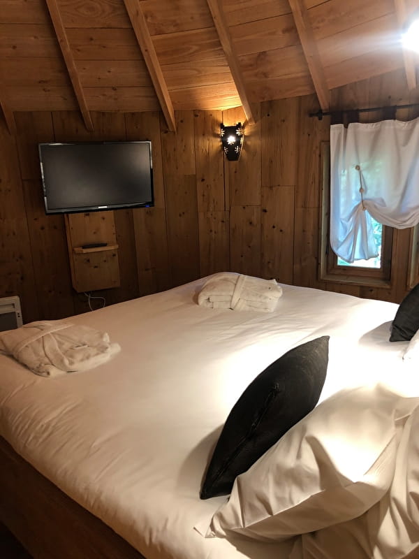 Quercus : cabane installée dans les arbres comprenant une pièce équipée d'un lit rond 2 personnes, d'une douche hammam, chromothérapie & musicothérapie, wc