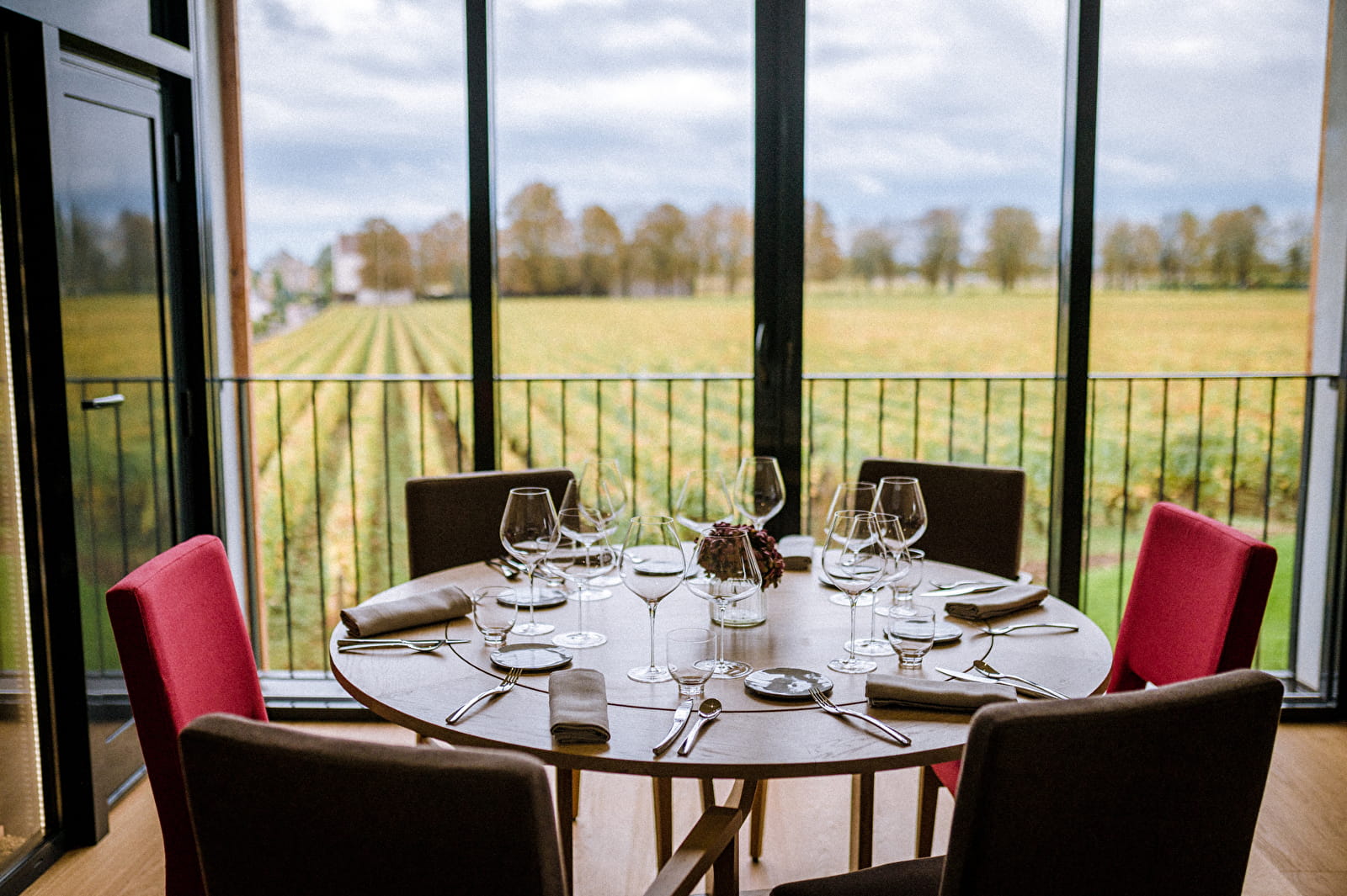 Au cœur du village de Meursault, entourée d'un Clos, une belle terrasse vous accueille pour le moment de l'apéritif, avant de profiter du repas dans une salle offrant une vue sur le vignoble et le parc.