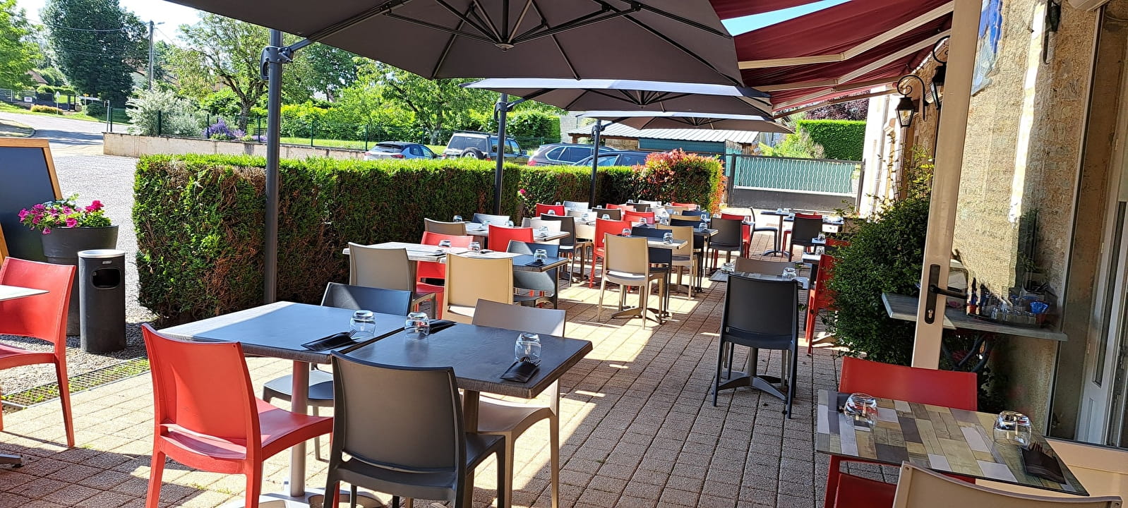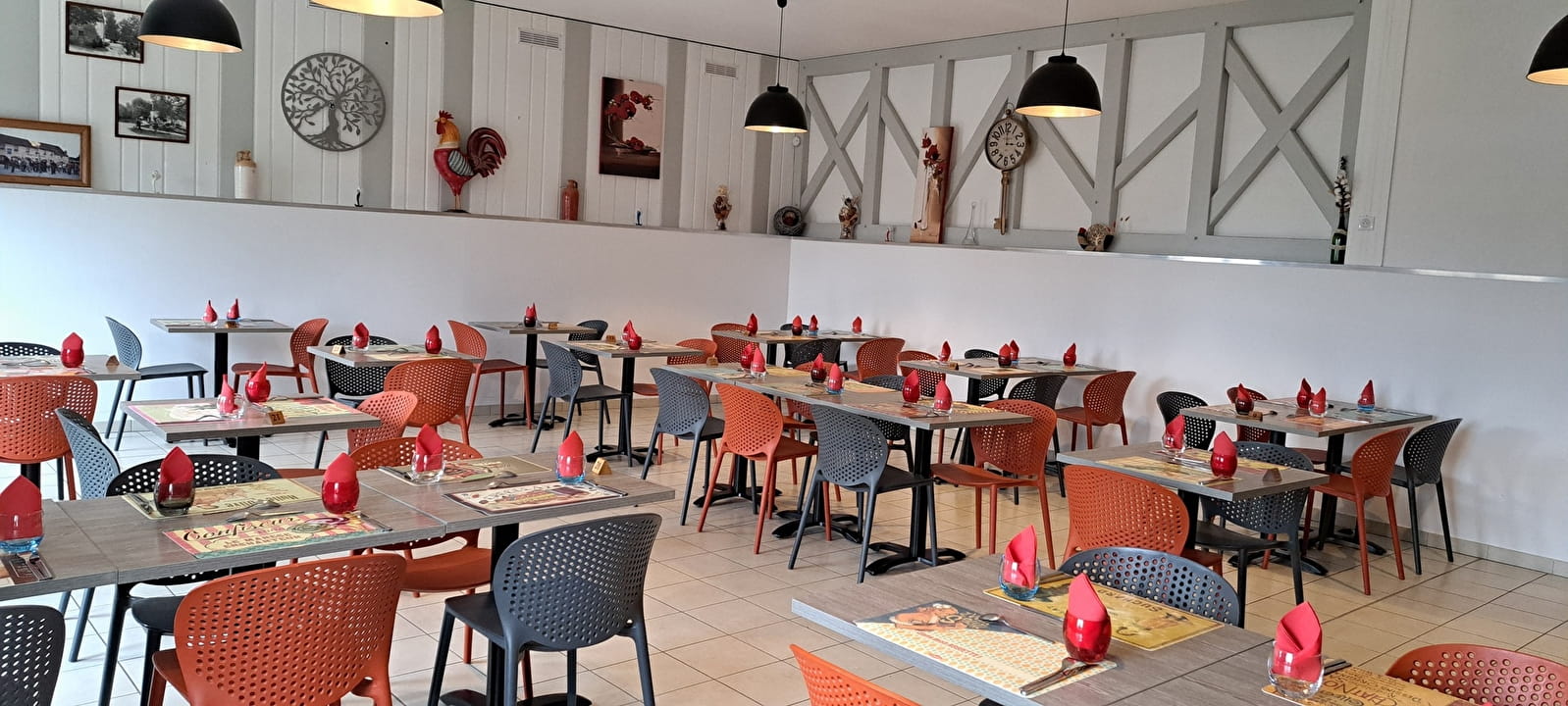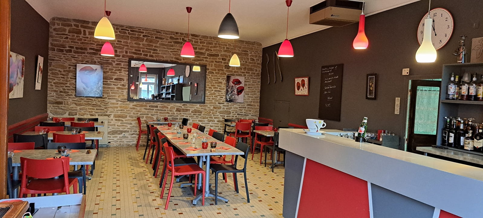 Nous avons une grande salle pouvant recevoir un groupe jusqu'à 60 personnes ainsi qu'une petite salle vers le bar pour 30 personnes et nous avons également une grande terrasse de 60 couverts donnant sur un grand parking gratuit.