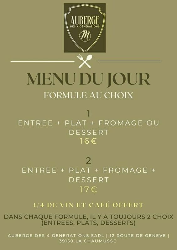 L'auberge 4 générations vous propose des plats élaborés à partir de produits frais, de saisons à déguster dans un décor agréable et un accueil très chaleureux.