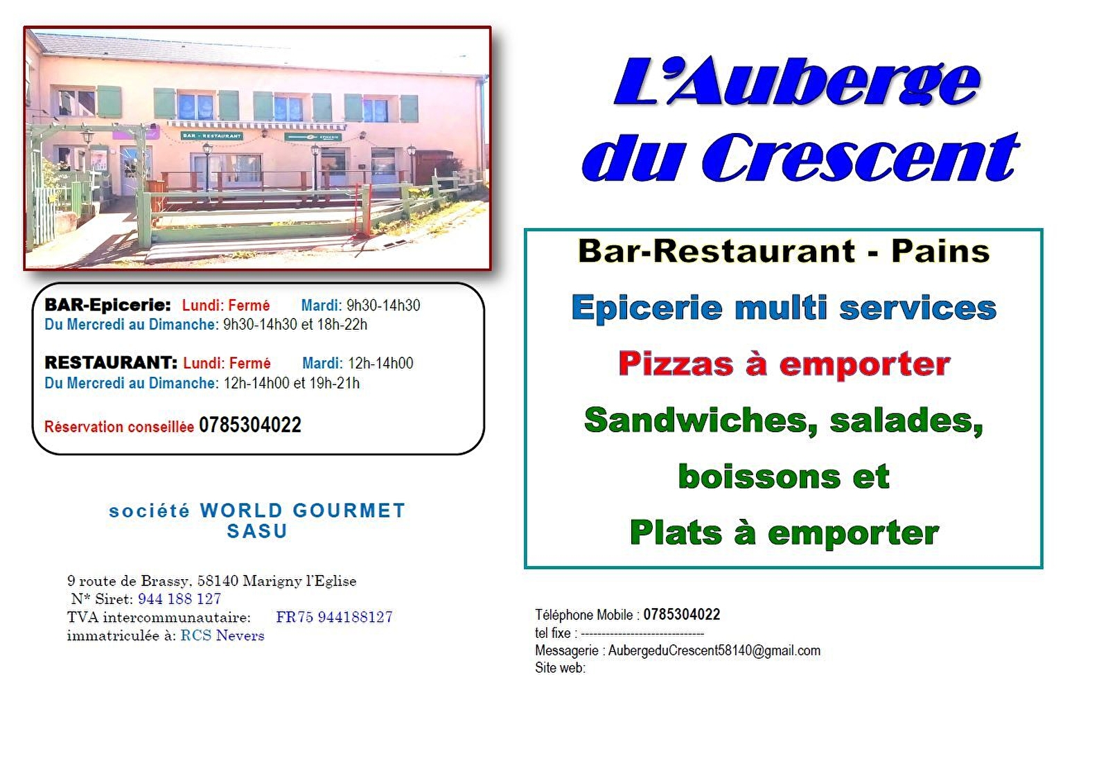 Au centre du village de Marigny l'Eglise, l'Auberge du Crescent, bar et restaurant, vous propose :