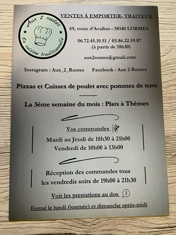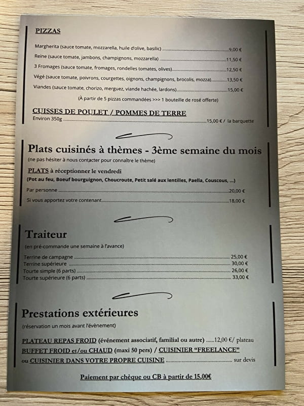 Préparation des plats dans un laboratoire professionnel par un chef cuisinier (35 ans d’expérience) Les plats sont issus de la cuisine traditionnelle (pot-au-feu, bœuf bourguignon, petit salé aux lentilles, coq au vin, couscous etc …) sans oublier les plats rapides (pizzas, poulets / pommes de terre). Très facile d’accès et de stationnement. Les commandes se font uniquement par téléphone ou par mail. Réception des plats les vendredis soirs à partir de 19 h dans un hall de réception (cadre chaleureux avec des arbustes, un petit canapé pour permettre au client de patienter dans les meilleures conditions) jouxtant le laboratoire de production où les clients pourront apercevoir le chef cuisinier en train de confectionner ses plats.