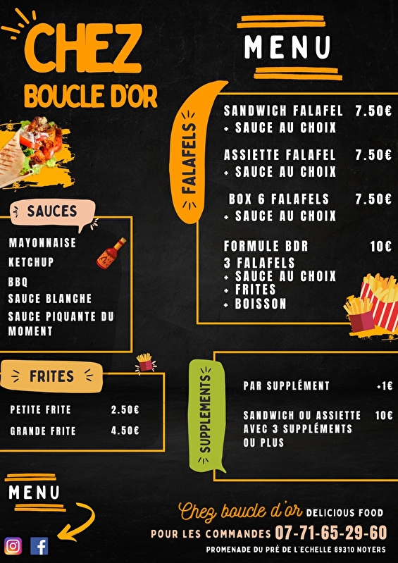 Chez Boucle d'or c'est le Food truck sur Noyers ouvert de 18 h 00 à 22 h 00 tous les vendredi, samedi et dimanche soir. Valentin vous propose des sandwichs et des salades, falafel, frites maison ainsi que des boissons fraîches.