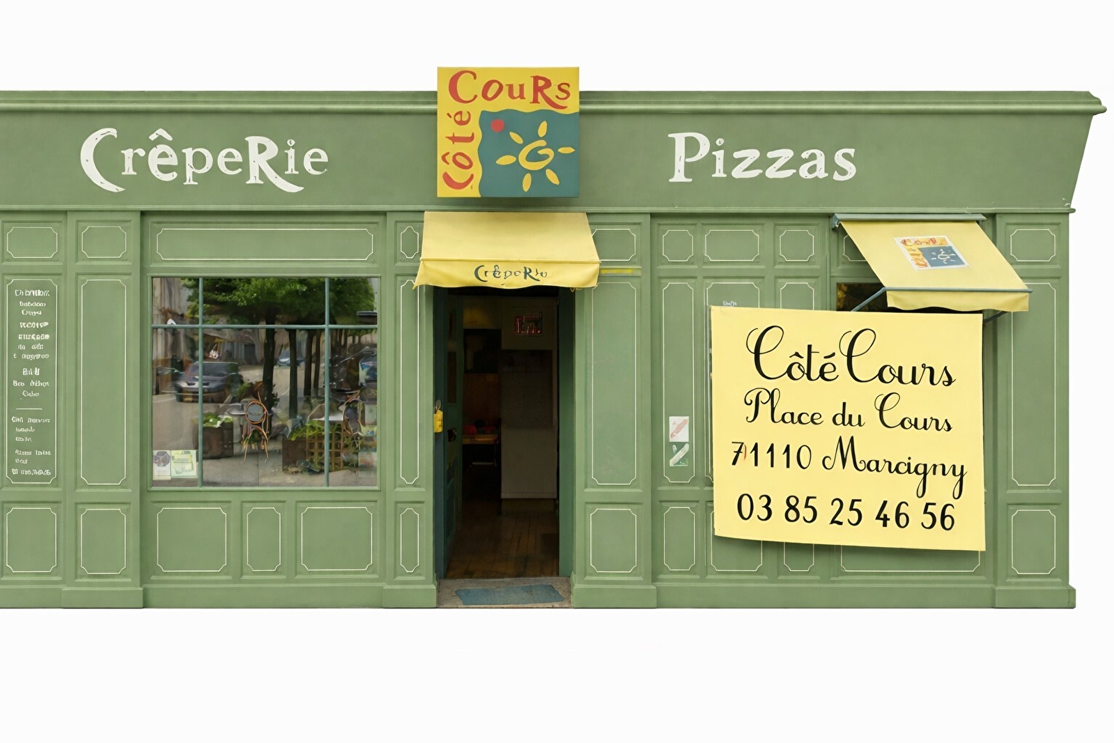 Carte. Galettes bretonnes, pizzas, salades composées, entrecôtes charolaises, crêpes.