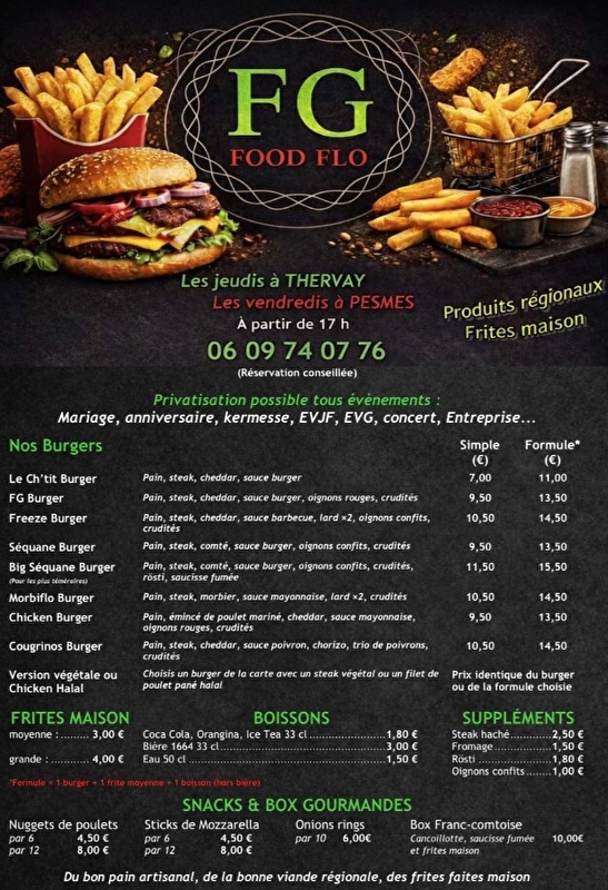 vous propose des frites maison un pain de son artisan boulanger (La pétrie dorée) , une viande régionale de premier choix (Tondus), fromagerie franc comtoise (Roy)