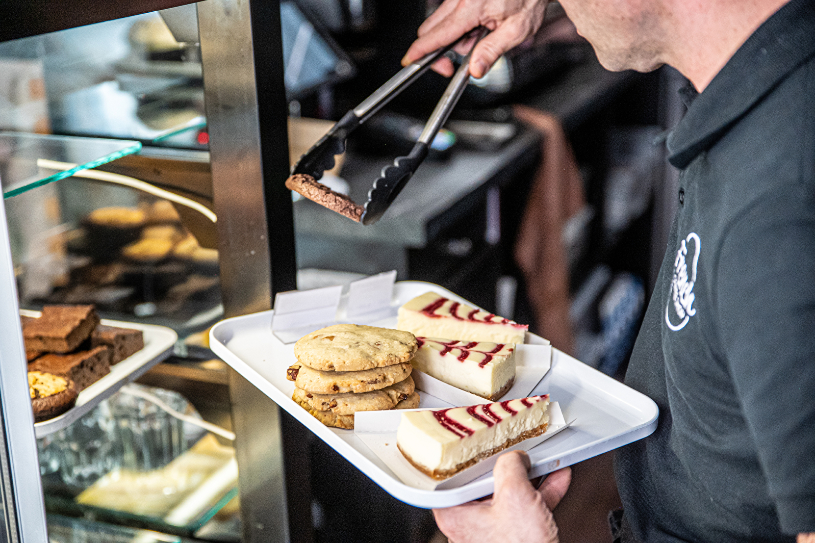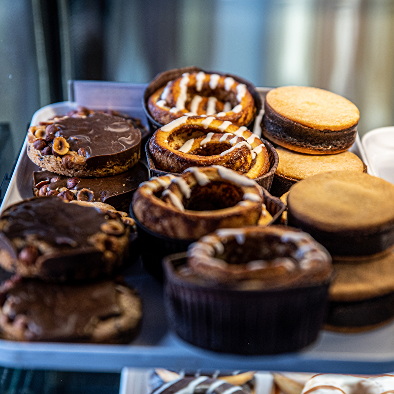 Pour l'accompagnement, une sélection de pâtisseries gourmandes (donuts, muffins) est proposée, ainsi qu'une gamme de snacking salé rapide adaptée à la pause déjeuner (ciabattas, croque-monsieur).