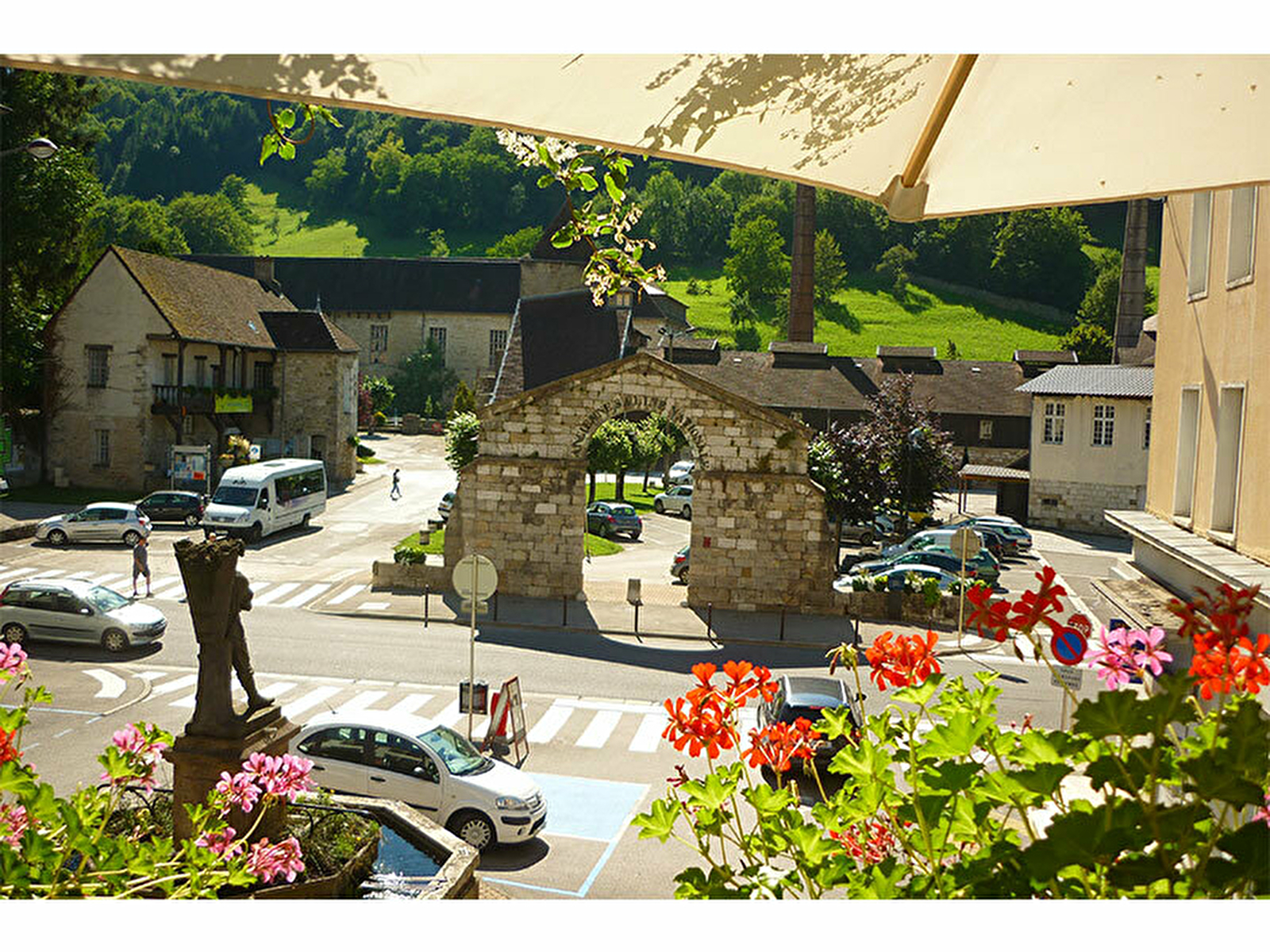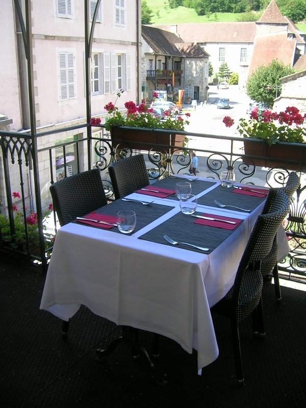 Durant les beaux jours, venez profiter de la terrasse suspendue au restaurant. Appréciez la vue sur la Grande Saline et les coteaux verdoyants de Salins-les-Bains ainsi que le fort St André au sommet.