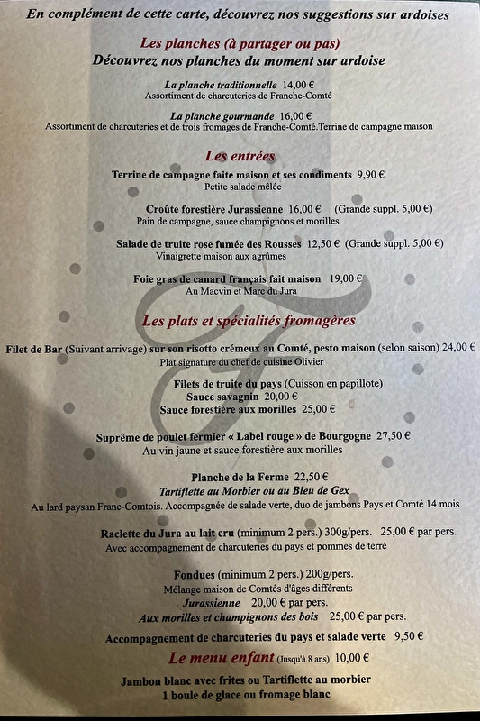 Dégustez fondue, raclette, tartiflette, poulet vin jaune & morilles, truite du pays, terrine maison, tarte myrtille, dans un cadre moderne & authentique. Hôtel-restaurant. Terrasse ombragée ouverte suivant météo.