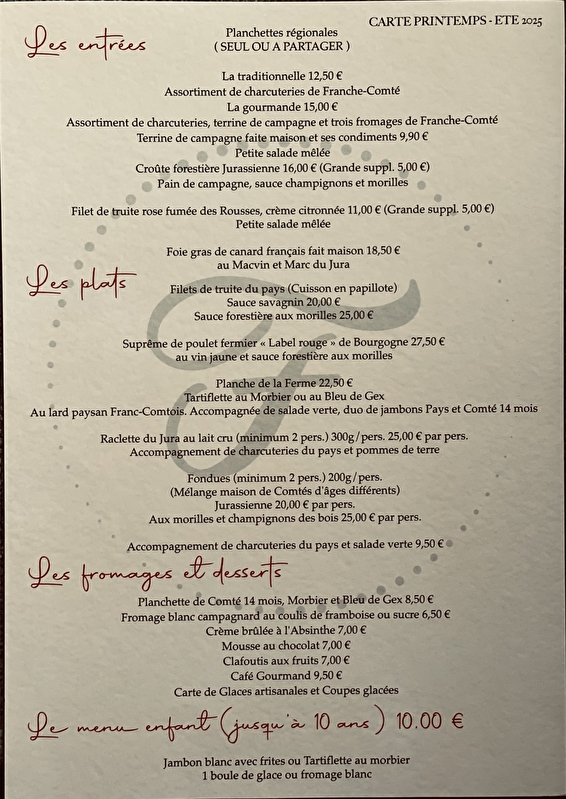 Dégustez fondue, raclette, tartiflette, poulet vin jaune & morilles, truite du pays, terrine maison, tarte myrtille, dans un cadre moderne & authentique. Hôtel-restaurant. Terrasse ombragée ouverte suivant météo.