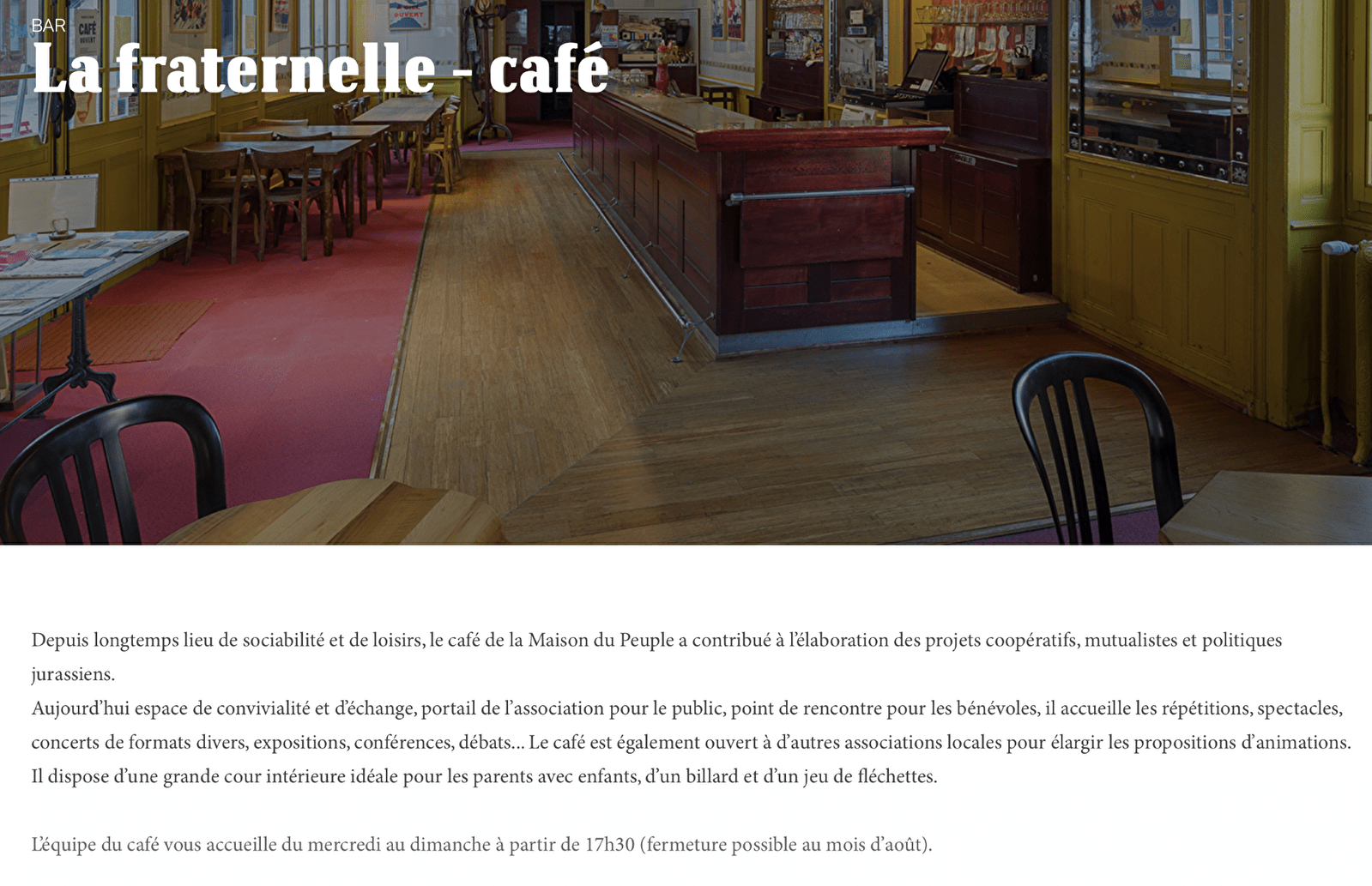 Depuis longtemps lieu de sociabilité et de loisirs, le café de la Maison du Peuple a contribué à l’élaboration des projets coopératifs, mutualistes et politiques jurassiens.