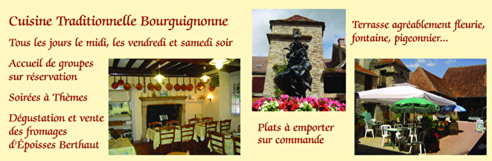 La devise de la maison : "on y mange bon, on s'y sent bien !" Bon accueil et convivialité dans un ancien relais de poste. Restauration traditionnelle et gastronomique avec des produits frais du terroir et de la région Auxois-Morvan, cuisine à l'Epoisses. Vidéo pour groupes sur la fabrication avec dégustation et vente de fromages d'époisses Berthaut. Traiteur en salle. Accueil de groupe, soirée à thèmes. Terrasse fleurie, fontaine, belle grange aménagée, pigeonnier. PMU. FDJ, Loto, Tabac du relais, Membre du Club des Hôteliers et Restaurateurs de Haute bourgogne.