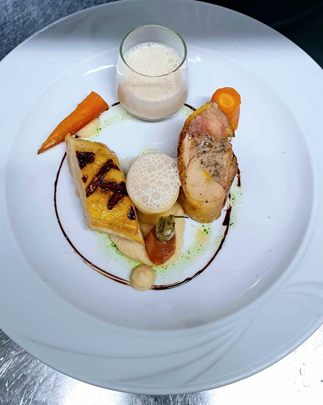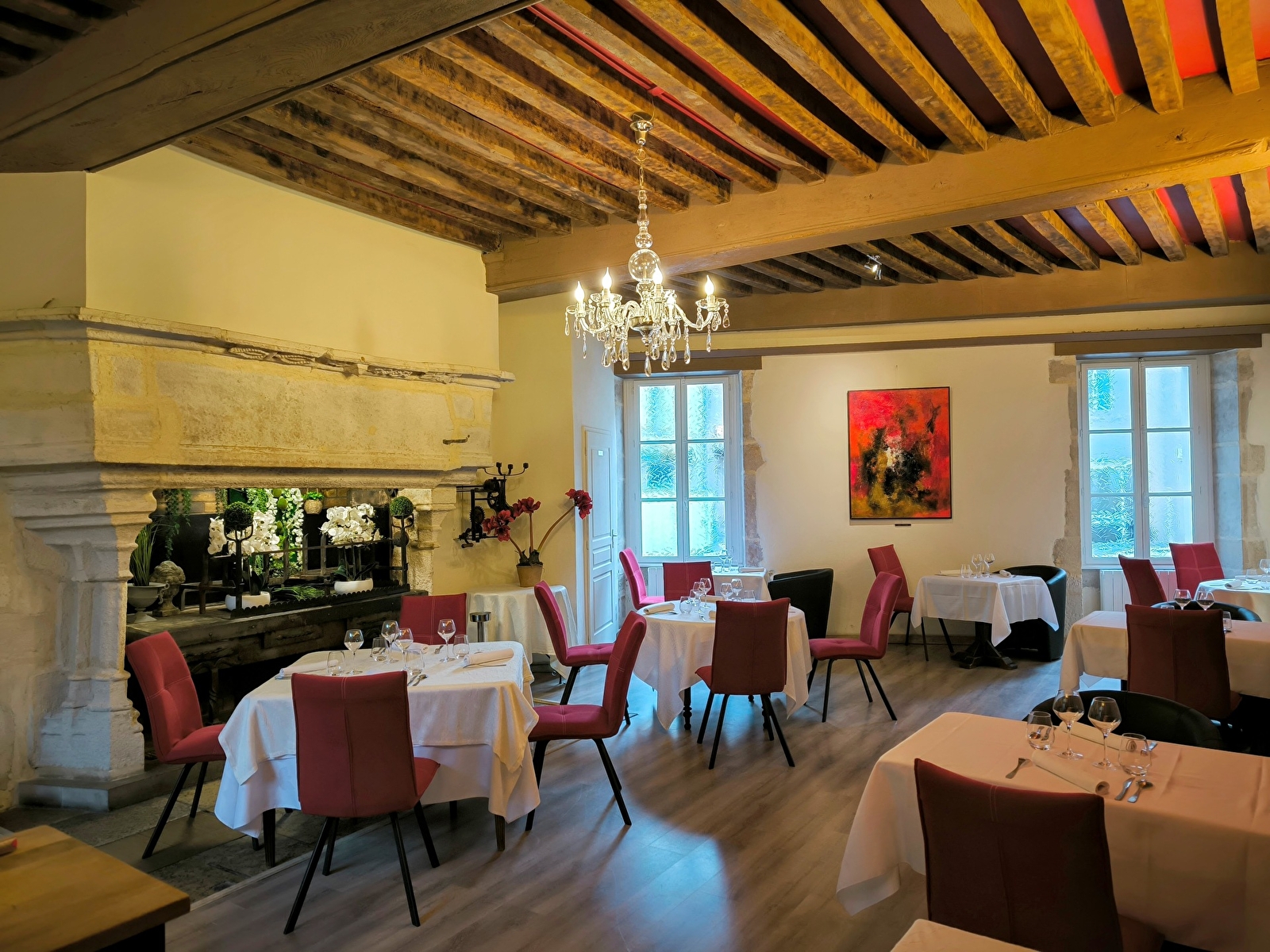 Cette belle demeure historique du XVIe siècle restaurée avec plafond à la française, est ornée dans la salle principale d'une magnifique cheminée d'époque. Grande cour privative ombragée et verdoyante dès le printemps, pour déjeuner ou diner en terrasse. Restaurant Eco-Responsable, Maître restaurateur de France.