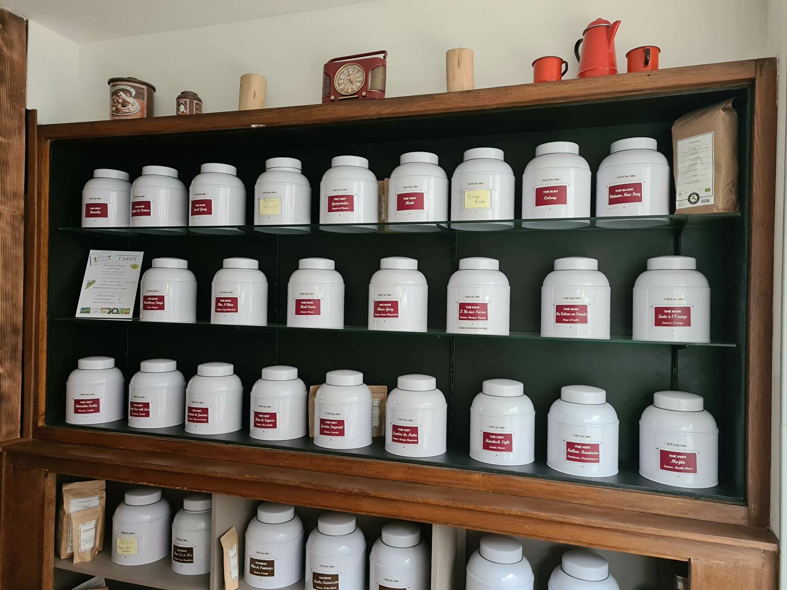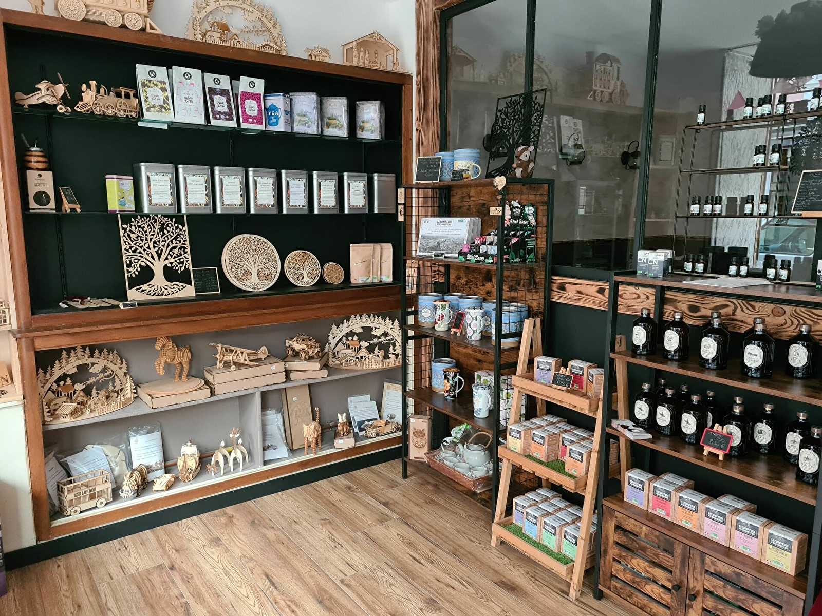Boutique et salon de thé (thés, tisanes, rooïbos, cafés, épices, huiles essentielles BIO) Objets décoratifs en bois fabriqués par nos soins.