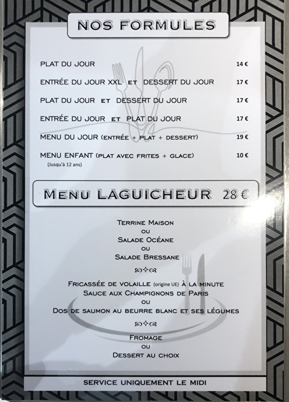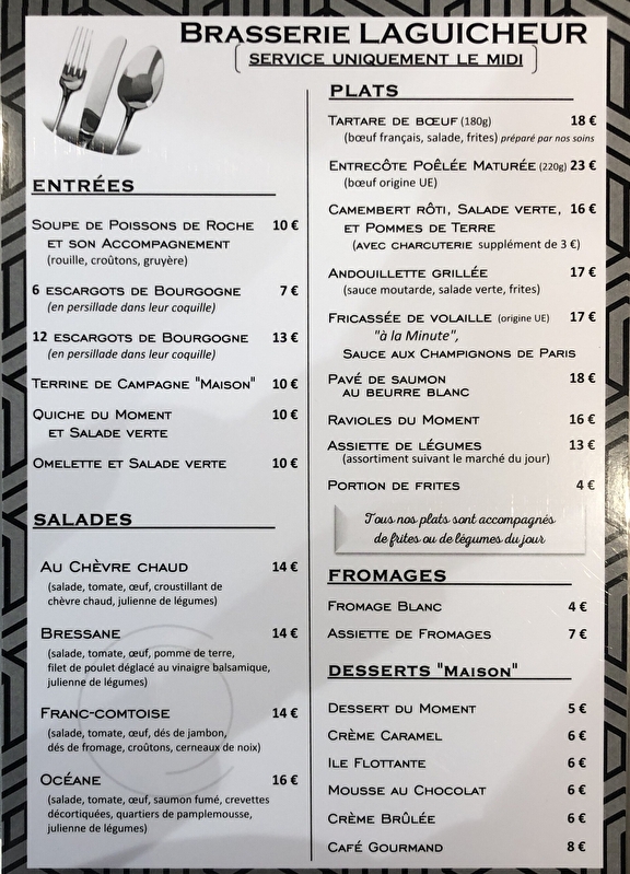 Laguicheur vous accueille toute la journée dans son bar et en terrasse. Des menus du jour, le midi uniquement, à base de produits frais, sont proposés avec un service rapide et efficace.