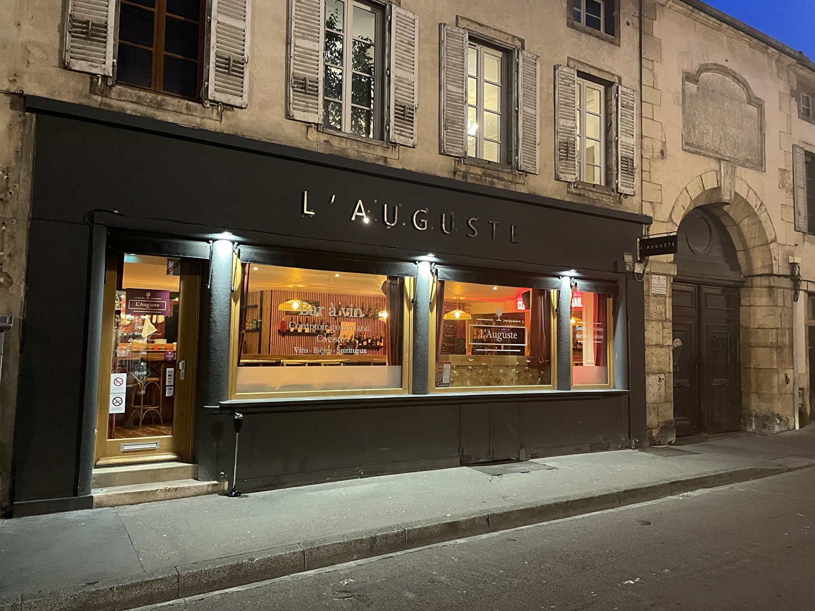 Situé au cœur historique de Dijon, à deux pas du Palais des Ducs et des États de Bourgogne, le bar à vin L'Auguste vous accueille dans un cadre chaleureux et une ambiance musicale. Sélection de crus mettant à l'honneur les trésors viticoles de Bourgogne et d'ailleurs ainsi qu'un choix de bières, de cocktails et de spiritueux.