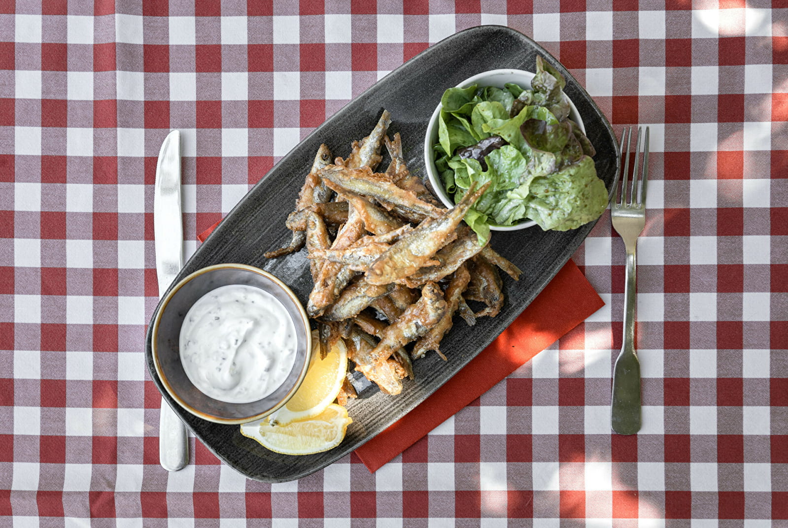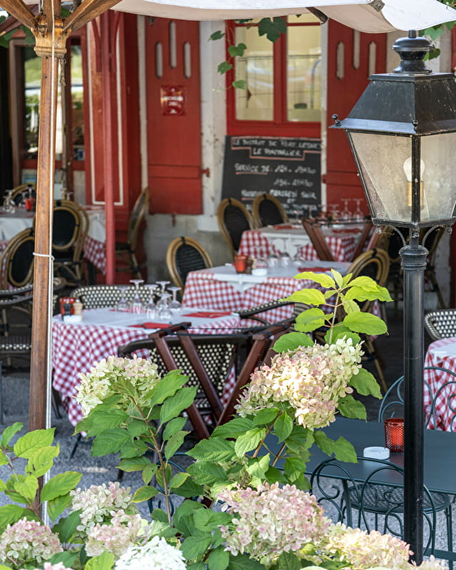 Sur la terrasse, les tables affichent joyeusement des nappes à carreaux rouges et blancs, une grande ardoise présente le menu et le plat du jour joliment écrits à la main.