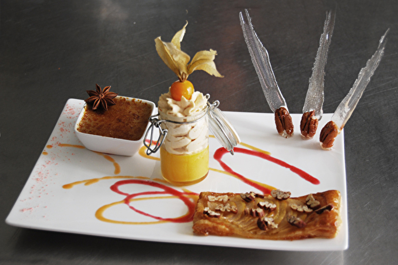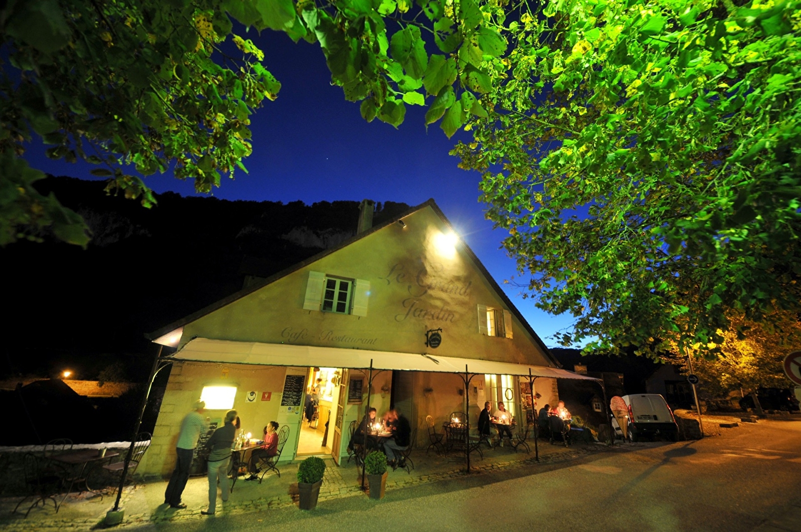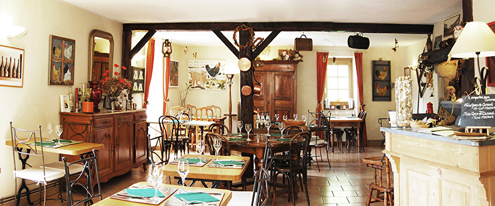 Cuisine du Terroir : truite au vin jaune, poulet de Bresse aux morilles, saucisses de Morteau au Poulsard, pièces à la broche (sur commande),café, glaces artisanales et pâtisseries en journée.