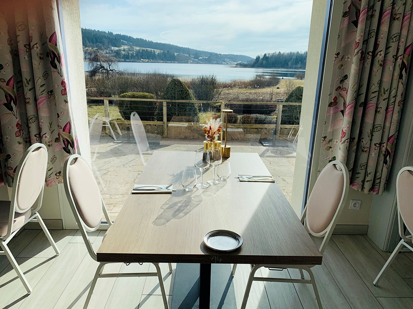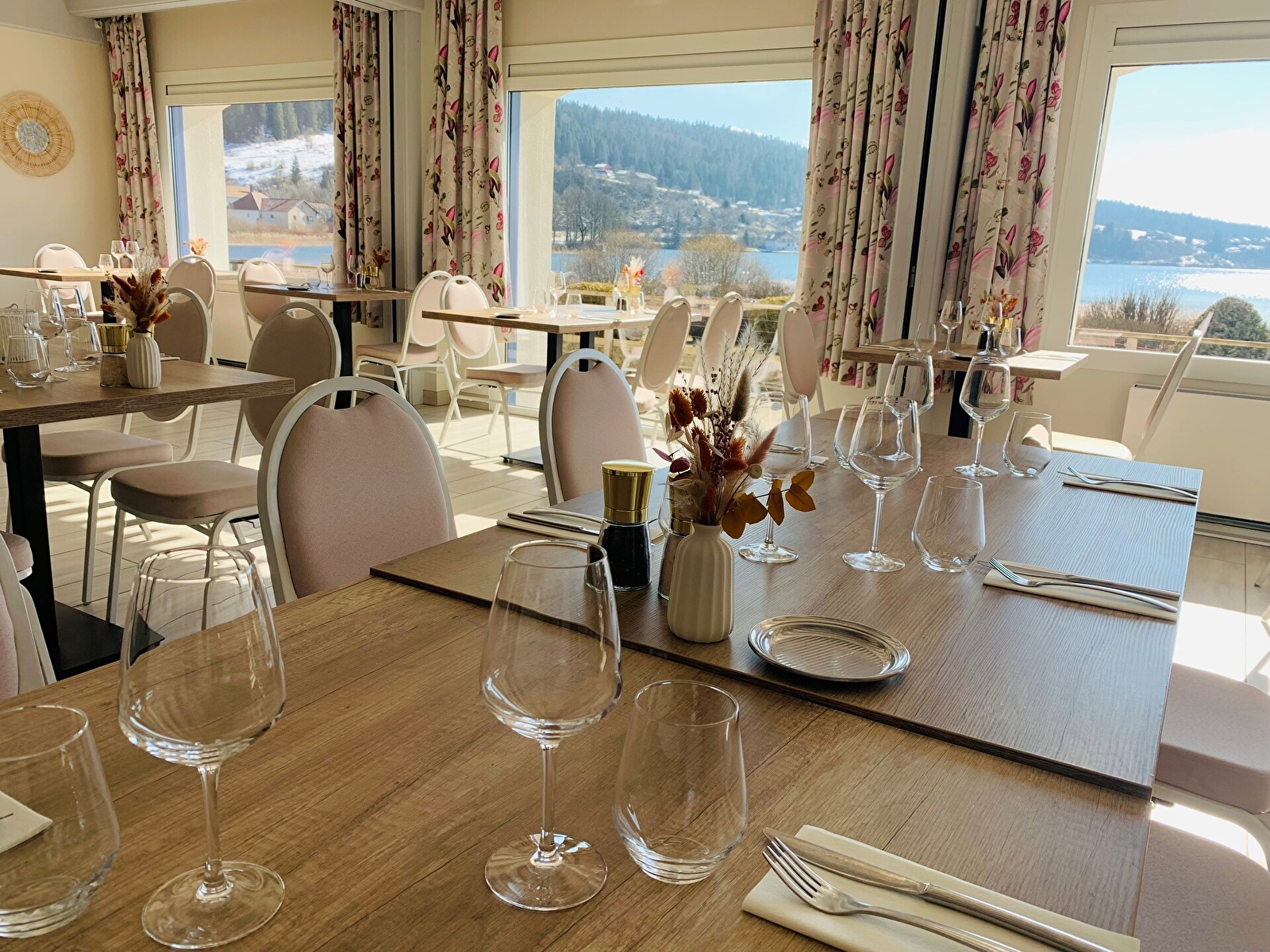 Que vous soyez avec votre moitié, en famille ou pour fêter un évènement particulier, notre grande salle modulable, jusqu'à 150 places, s'ajuste à toute demandes. Grâces à nos grandes baies vitrées, venez découvrir la vue imprenable sur le lac de l'Abbaye.
