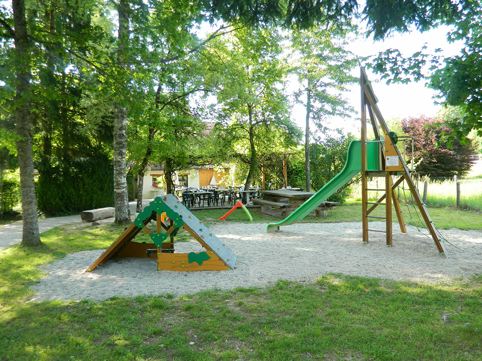 Pour les journées ensoleillées, une grande terrasse ombragée avec une aire de jeux pour les enfants