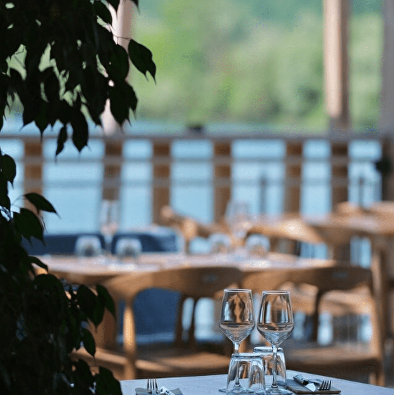 Le cadre met l'accent sur la nature, avec une vue spectaculaire sur le lac, que l'on peut apprécier en salle ou sur la vaste terrasse "les yeux dans l'eau". L'établissement est connu pour son ambiance festive, proposant régulièrement des animations et des soirées musicales.