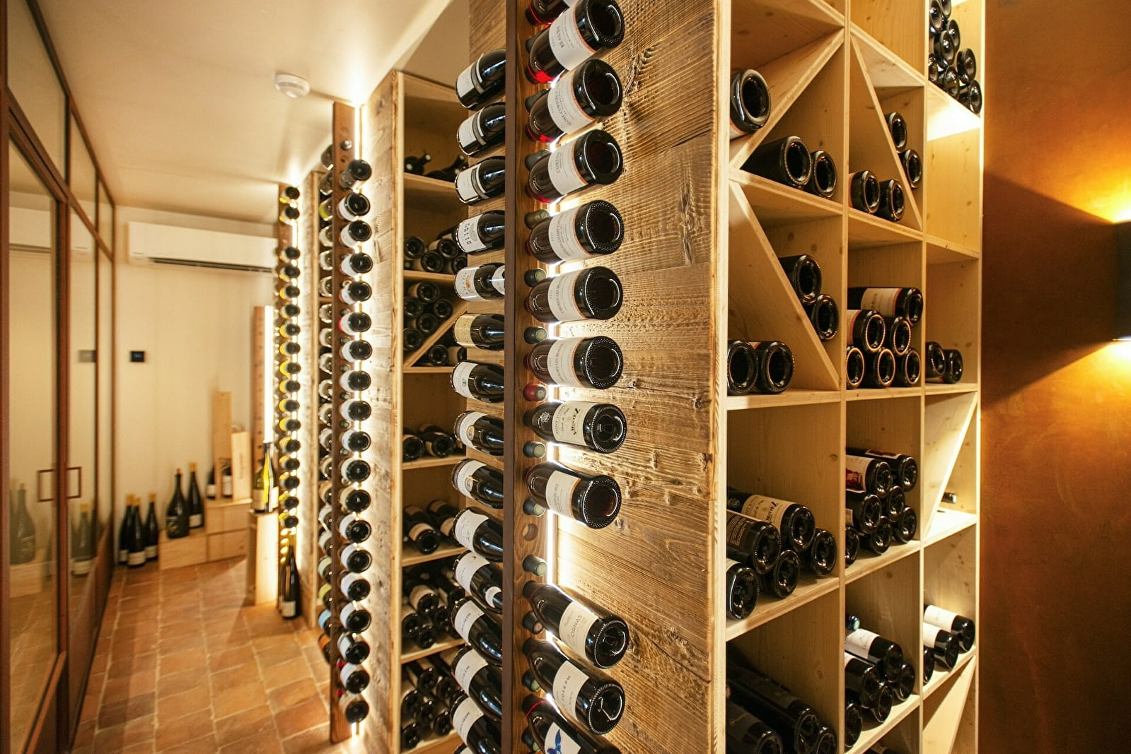 A votre disposition, un bar avec salon jouxtant une cave vitrée où sont exposée les vins des domaines bourguignons et d'ailleurs que nous aimons.