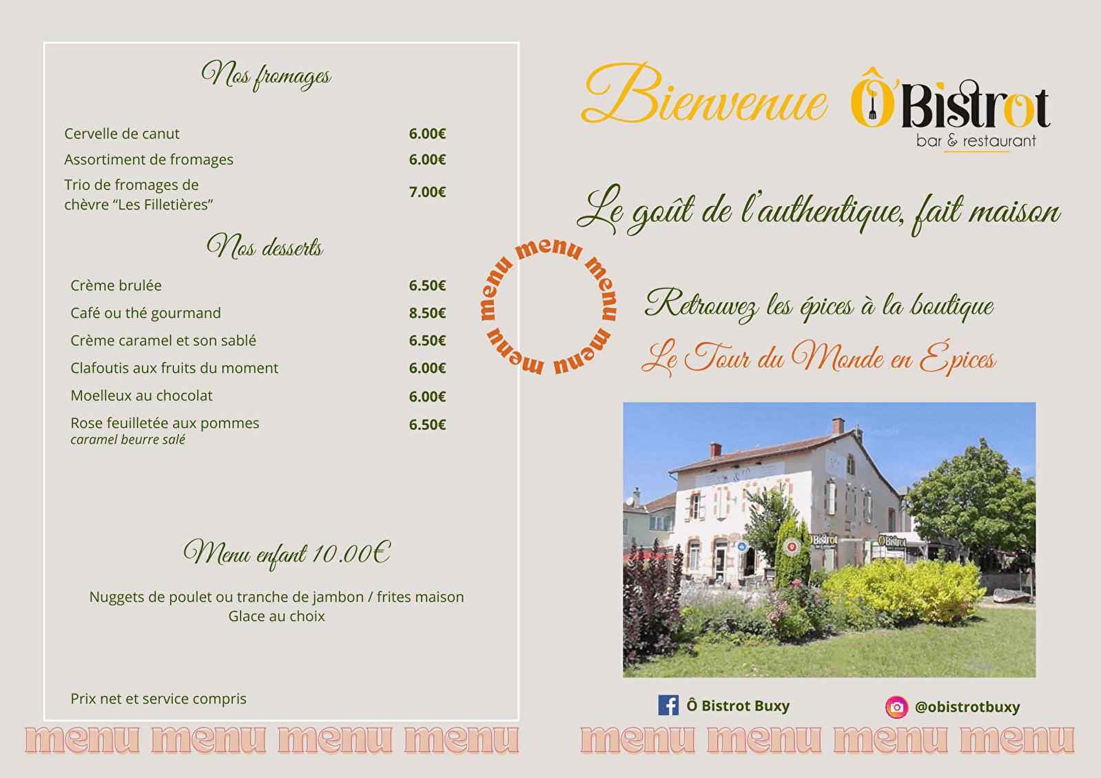 - Menu enfant : Tarif unique de 10€