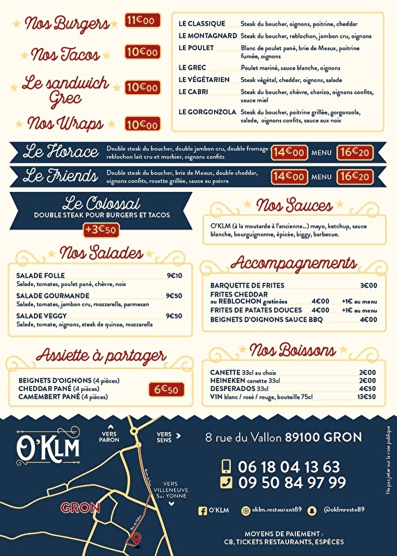 Nous sommes Hélène et Frédéric, les propriétaires du restaurant O'KLM de Gron. Nous avons le plaisir de vous accueillir dans un lieu chaleureux et convivial. Notre établissement propose un choix varié de burgers, sandwichs grecs, salades, tacos, wraps et desserts. Nos différents plats sont cuisinés avec des produits frais, locaux et de qualité. Nous préparons votre commande en direct, à consommer sur place ou à emporter.