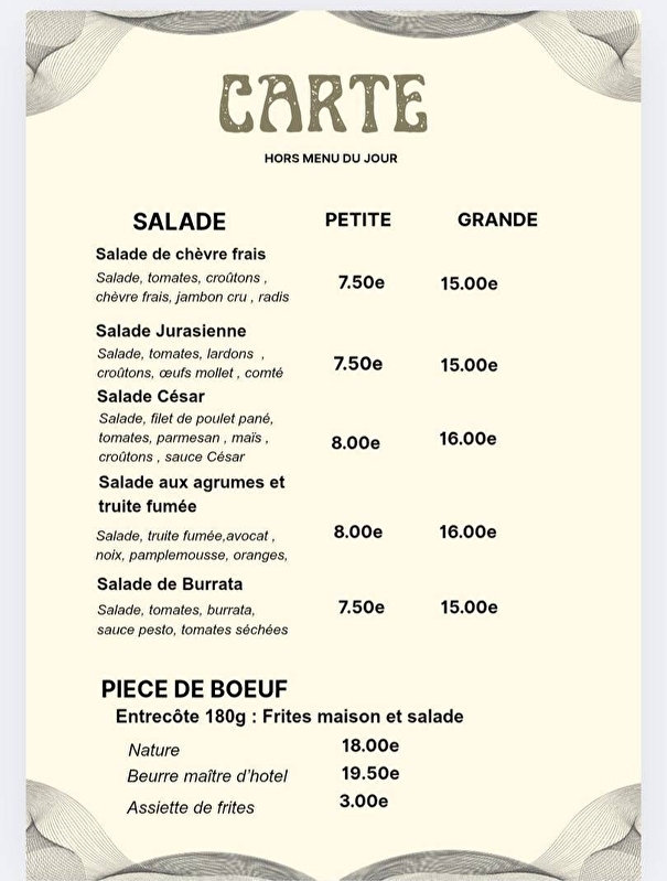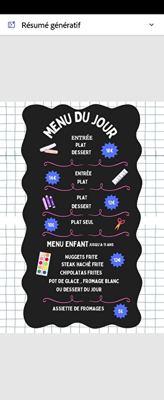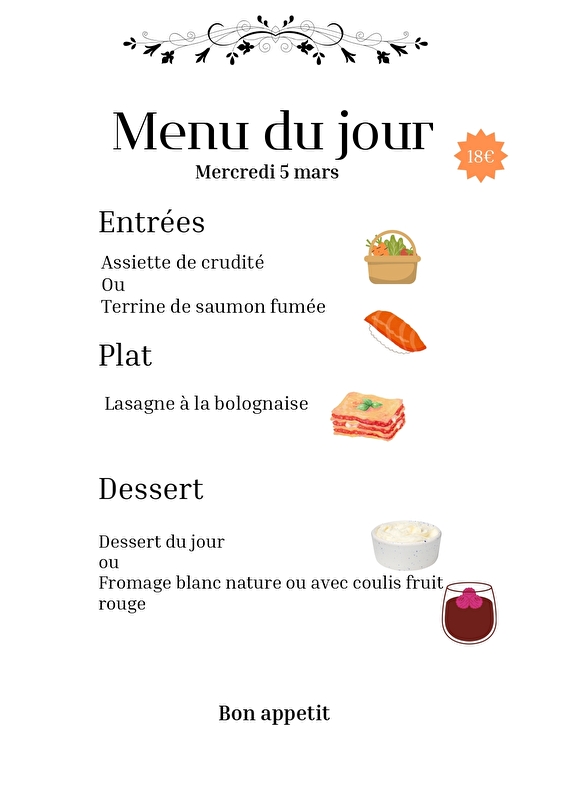 Tarifs :- Menu adulte : Compris entre 10€ et 18€