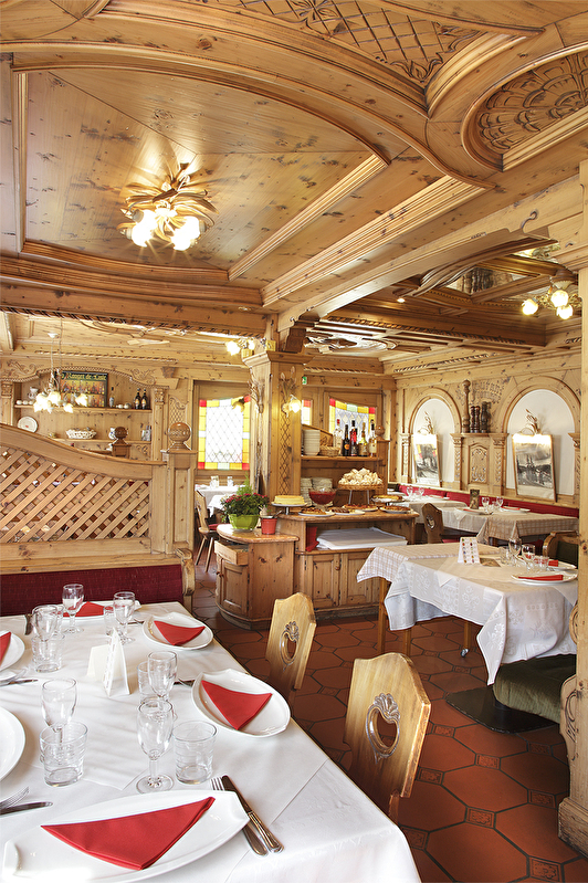 Restaurant avec un décor unique en bois sculpté à la main déclinant le fromage sous toutes ses formes.