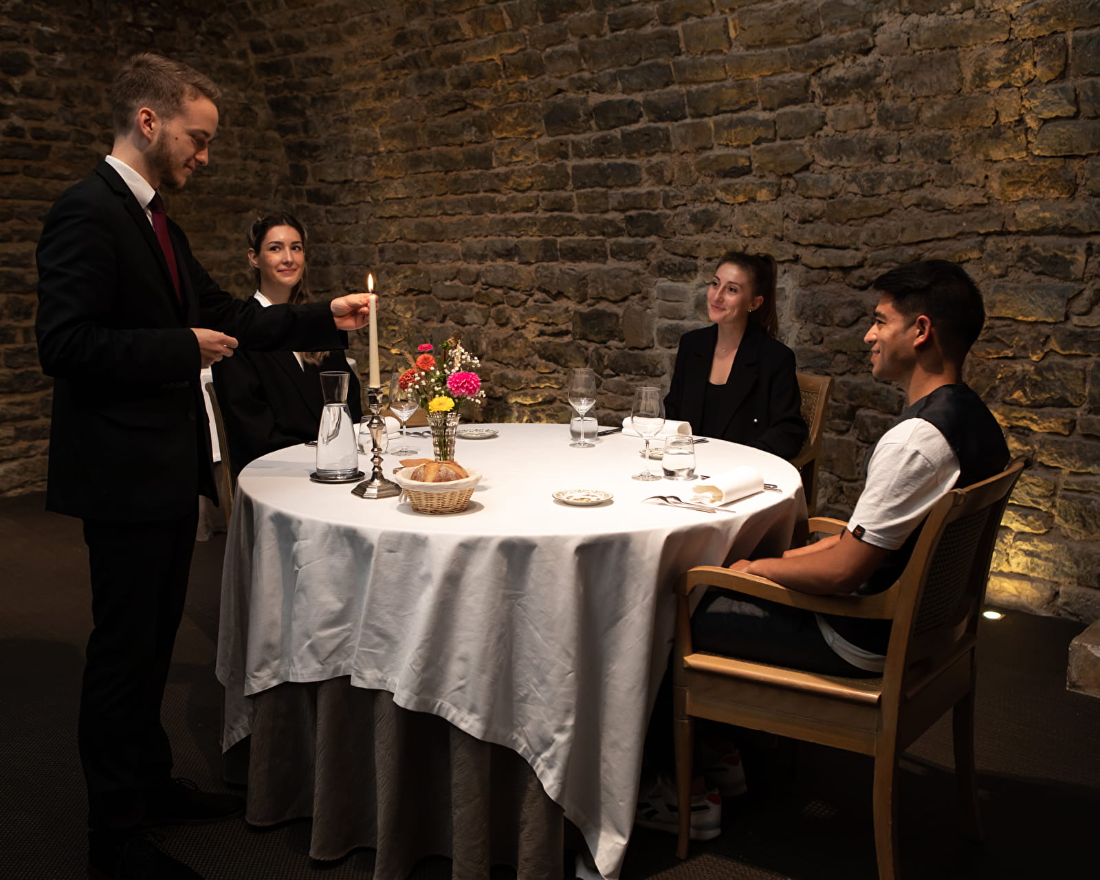 Horaires de service : de 12h15 à 13h30 au déjeuner et de 19h15 à 21h00 au diner.