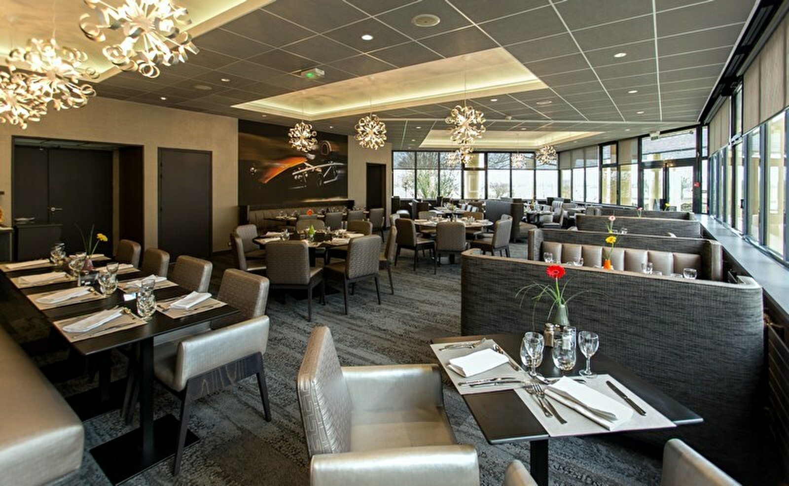 Le restaurant Le Paddock, entièrement rénové dans un esprit contemporain et sportif, s’ouvre sur la terrasse avec piscine et vue sur la campagne nivernaise.