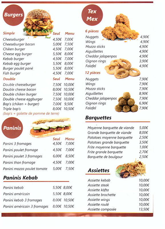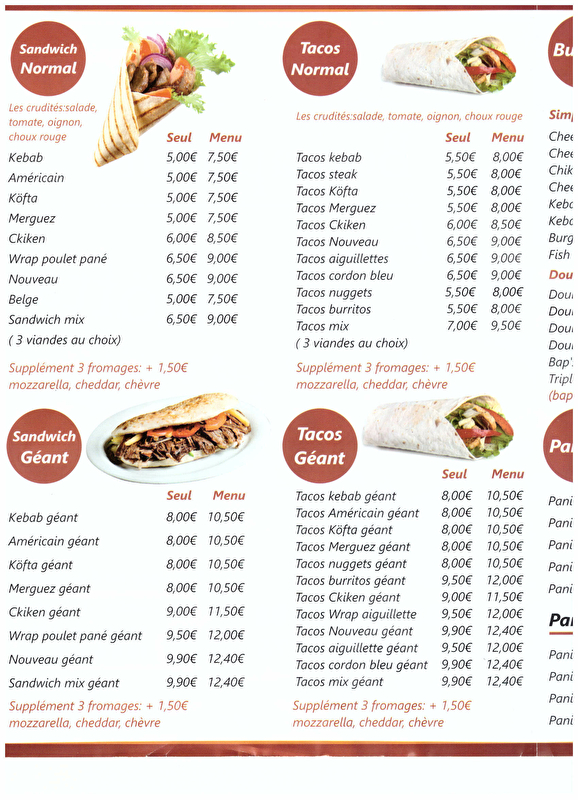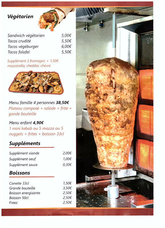 Au plus près de vos attentes, adapté au goût de chacun, et en privilégiant la qualité avec ses pains fait maison, Le Sultan Kebab vous propose un menu riche en variété sur place ou à emporter : Kebabs, Burgers, Paninis, Tacos, Tex mex, Assiettes, ou même des Sandwichs ou Tacos imaginés par et pour vous!!!
