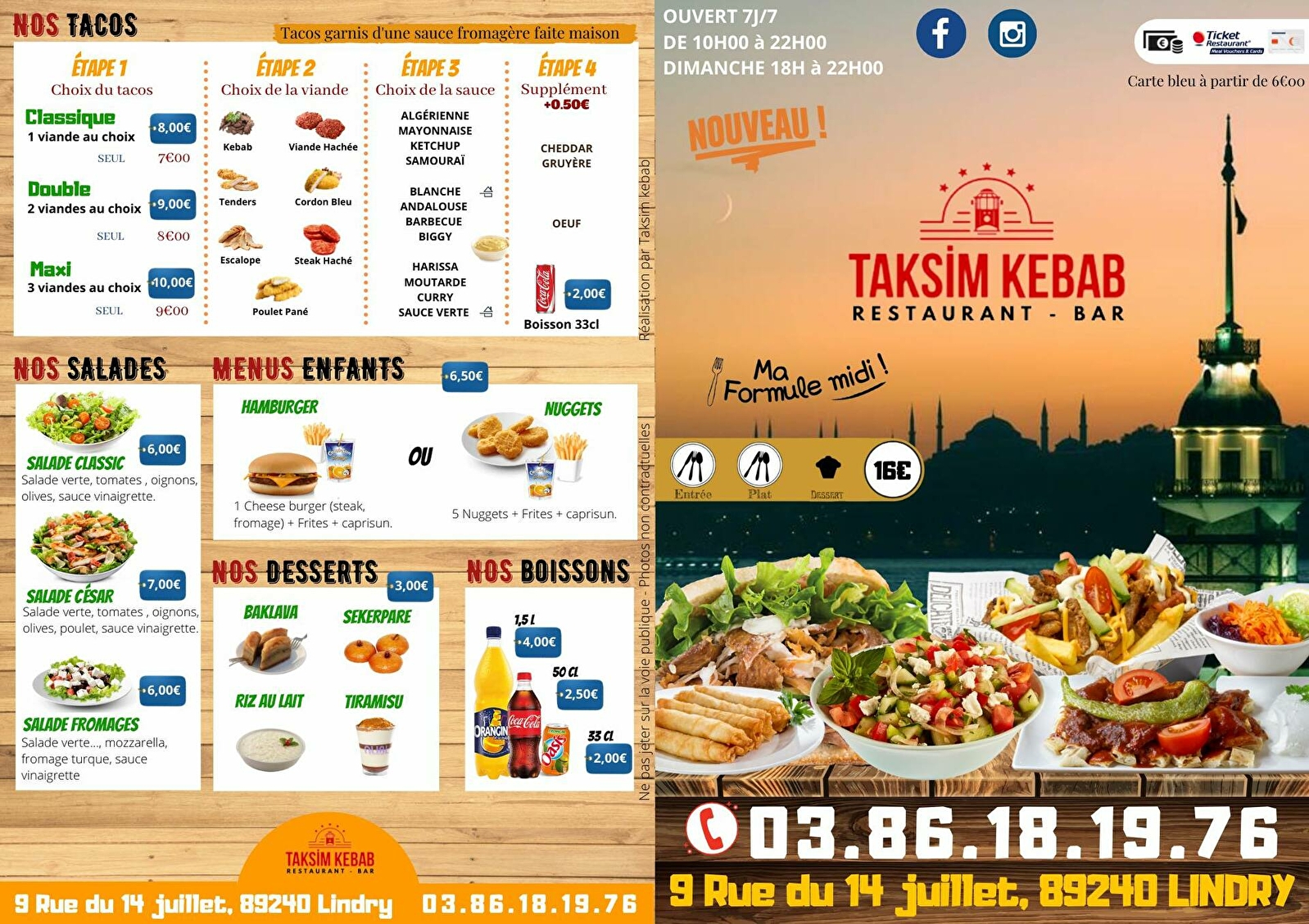 Entre ami(e)s ou en famille, le Taksim Kebab vous accueille tous les jours de 10h00 à 22h00 et le dimanche de 18h00 à 22h00. Venez déguster nos spécialités.