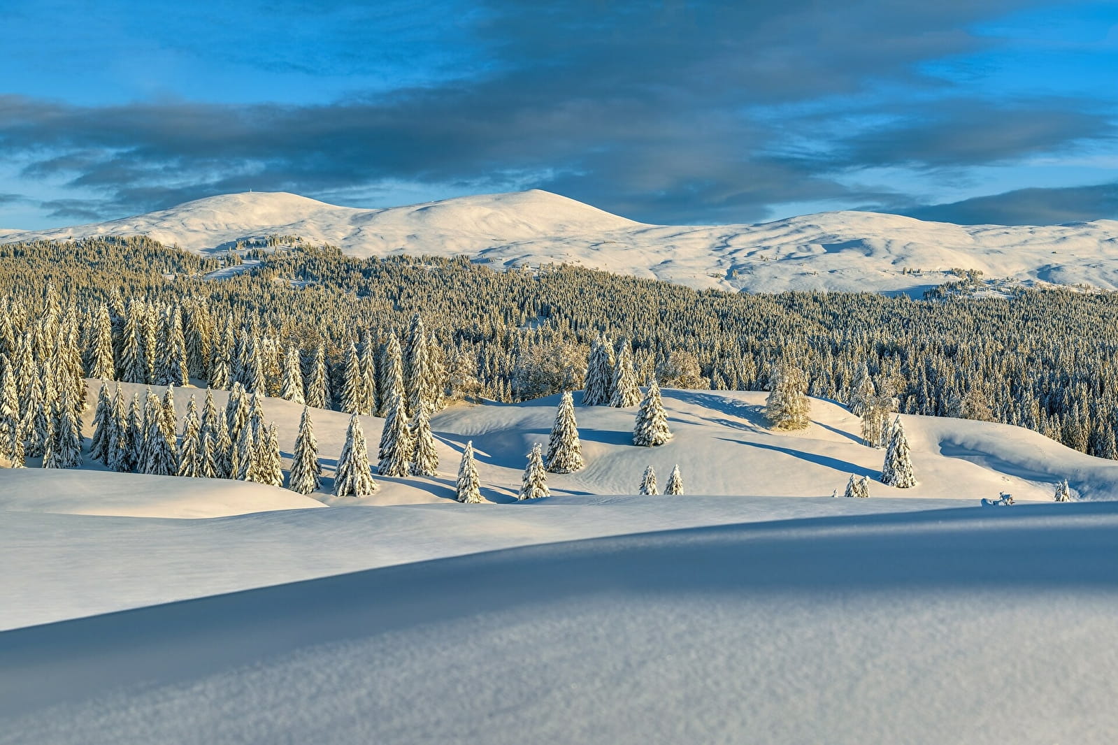 La Grande Traversée du Jura à raquettes : un itinéraire spécifique, adapté à ce moyen de locomotion ! Se faufiler entre 2 épicéas pour déboucher dans une clairière, vaste combe qui se prolonge au loin par la vue sur les Monts Jura. Reliefs qui s’adoucissent avec la neige.